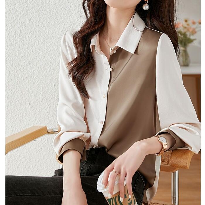 大きいサイズ 体型カバー トップス ブラウス シャツ バイカラー アシンメトリー エレガント レディース 大人 可愛い きれいめ カジュアル フェミニン 長袖 おしゃれ クラシカル 通勤 オフィス ナチュラル シンプル ベージュ 春 秋 冬 20代 30代 40代 50代