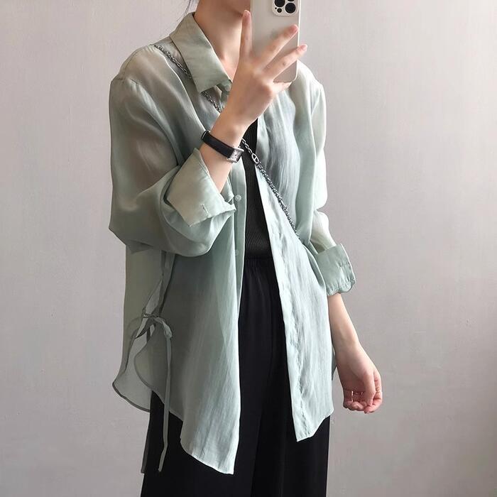 全3色 大きいサイズ 体型カバー 日焼け防止 冷房対策 トップス ブラウス シャツ シアー サイドリボン エレガント レディース 大人 可愛い きれいめ カジュアル フェミニン 長袖 おしゃれ 透け感 薄手 シンプル オーバーサイズ ゆったり ピンク グリーン 緑 ホワイト 白 春 秋 夏 20代 30代 40代 50代