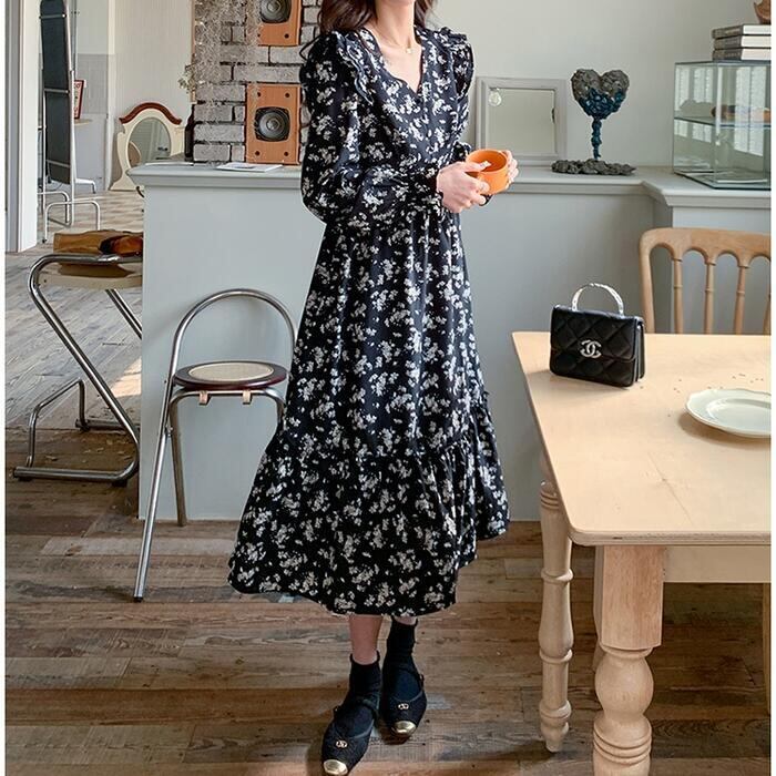 大きいサイズ 体型カバー ワンピース ワンピ ドレス 袖あり 花柄 フラワー ボタニカル フリル レディース エレガント きれいめ カジュアル 大人 可愛い フェミニン ティアード ミモレ丈 Aライン 長袖 ゆったり 楽ちん ブラック 黒 春 冬 秋 20代 30代 40代 50代