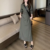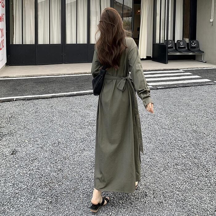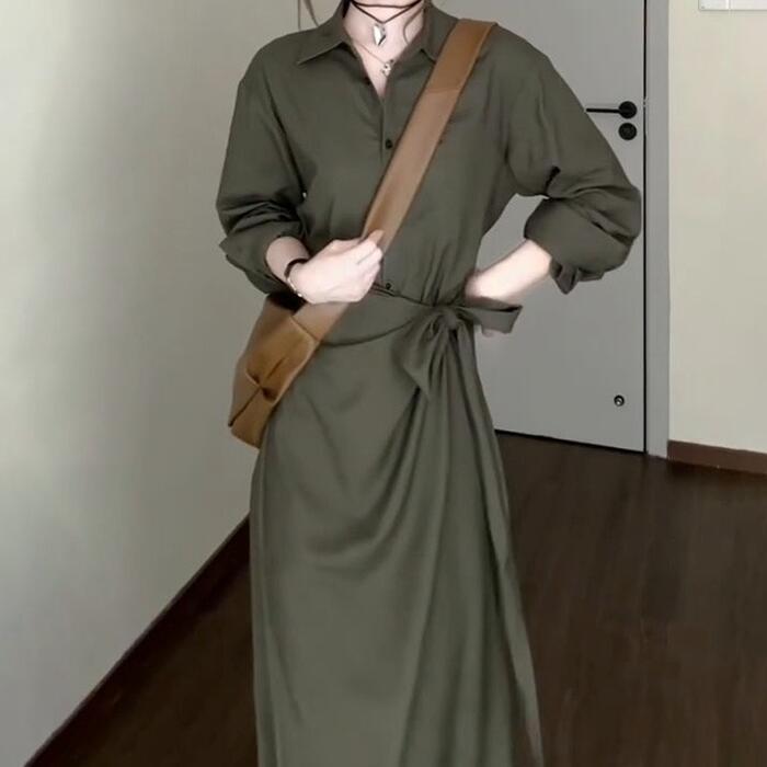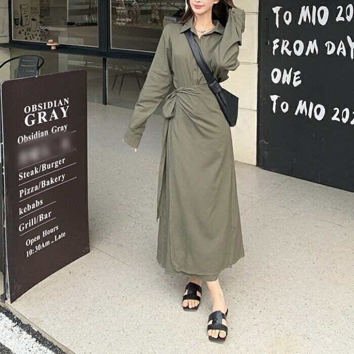 大きいサイズ 体型カバー ワンピース ワンピ ドレス 袖あり シャツワンピ ウエストリボン レディース エレガント きれいめ カジュアル 大人 可愛い フェミニン 襟付き ロング丈 長袖 シンプル 韓国 おしゃれ グリーン 緑 春 冬 秋 20代 30代 40代 50代