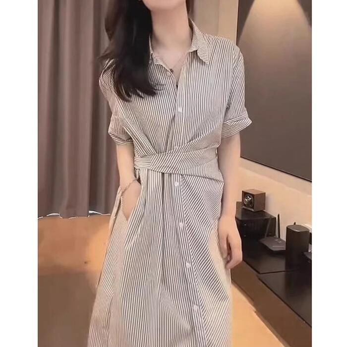 大きいサイズ 体型カバー ワンピース ワンピ ドレス 袖あり ストライプ柄 シャツワンピ レディース エレガント きれいめ カジュアル 大人 可愛い フェミニン ウエストベルト ミモレ丈 ひざ丈 おしゃれ Aライン 半袖 ベージュ 春 夏 秋 20代 30代 40代 50代