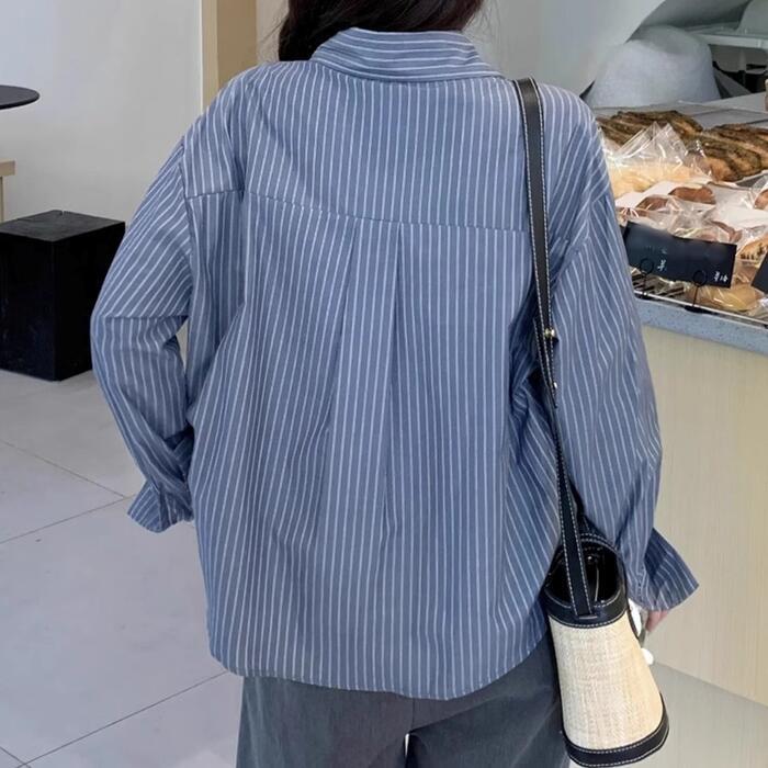 大きいサイズ 体型カバー トップス ブラウス シャツ ジャケット ストライプ柄 エレガント レディース 大人 可愛い きれいめ カジュアル フェミニン 長袖 おしゃれ アシンメトリー ゆったり 通勤 オフィス 青 ブルー 春 秋 冬 20代 30代 40代 50代