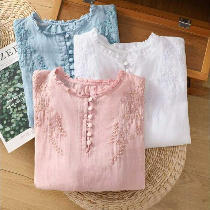 全3色 大きいサイズ 体型カバー トップス ブラウス シャツ 綿麻 コットン リネン 刺繍 花 フラワー プルオーバー エレガント レディース 大人 可愛い きれいめ カジュアル フェミニン 七分袖 おしゃれ 透け感 薄手 ピンク ブルー 青 ホワイト 白 春 秋 夏 20代 30代 40代 50代
