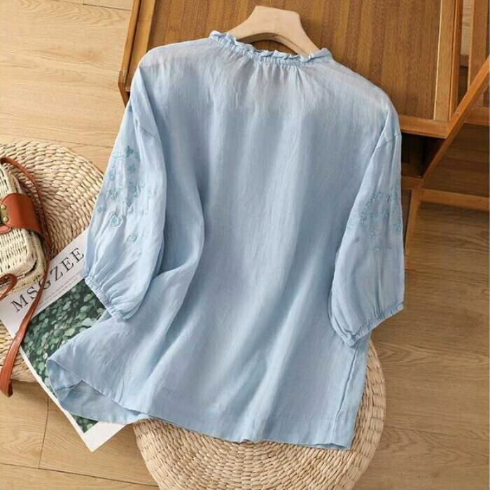 繊細なフラワー刺繍が可愛い七分袖ブラウス。