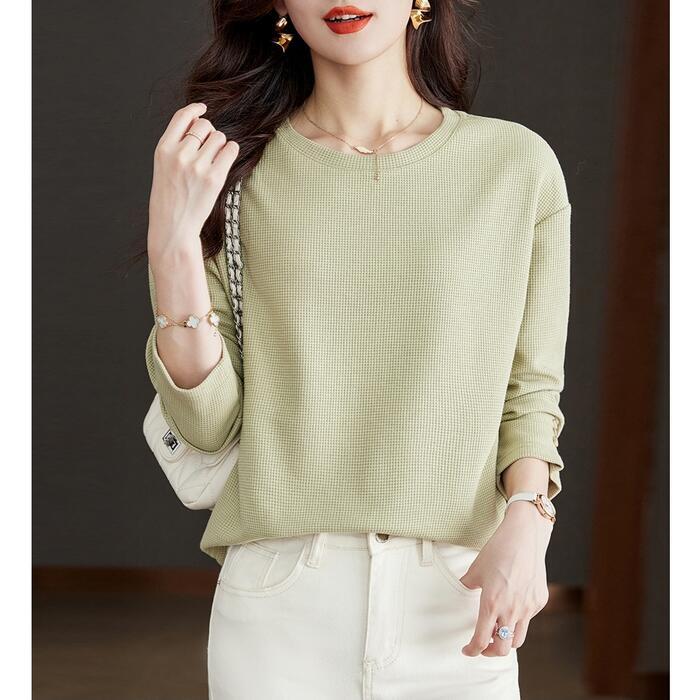 大きいサイズ 体型カバー トップス Tシャツ カットソー ロンT プルオーバー クルーネック ワッフル サーマル エレガント レディース 大人 可愛い きれいめ カジュアル フェミニン 長袖 シンプル インナー グリーン 緑 春 秋 冬 20代 30代 40代 50代
