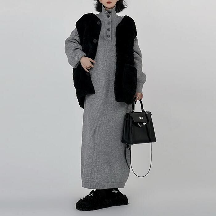 ボタンの開閉で首元のアレンジができるニットワンピース。