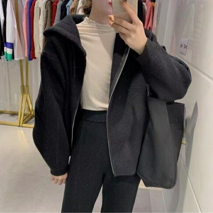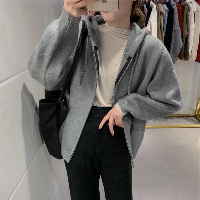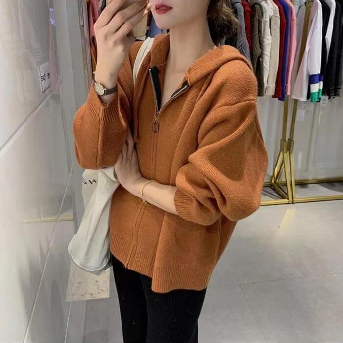 全4色 大きいサイズ 体型カバー シンプル トップス ニット パーカー ジップアップ セーター ジャケット カーディガン フード エレガント レディース 大人 可愛い きれいめ カジュアル フェミニン 長袖 おしゃれ イエロー ブルー 青 ブラック 黒 グレー 春 秋 冬 20代 30代 40代 50代
