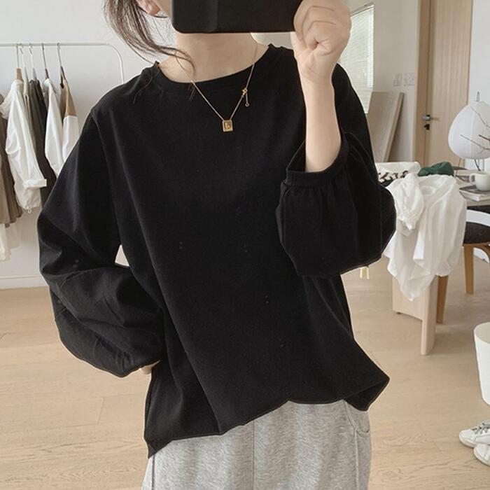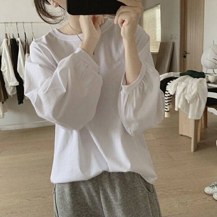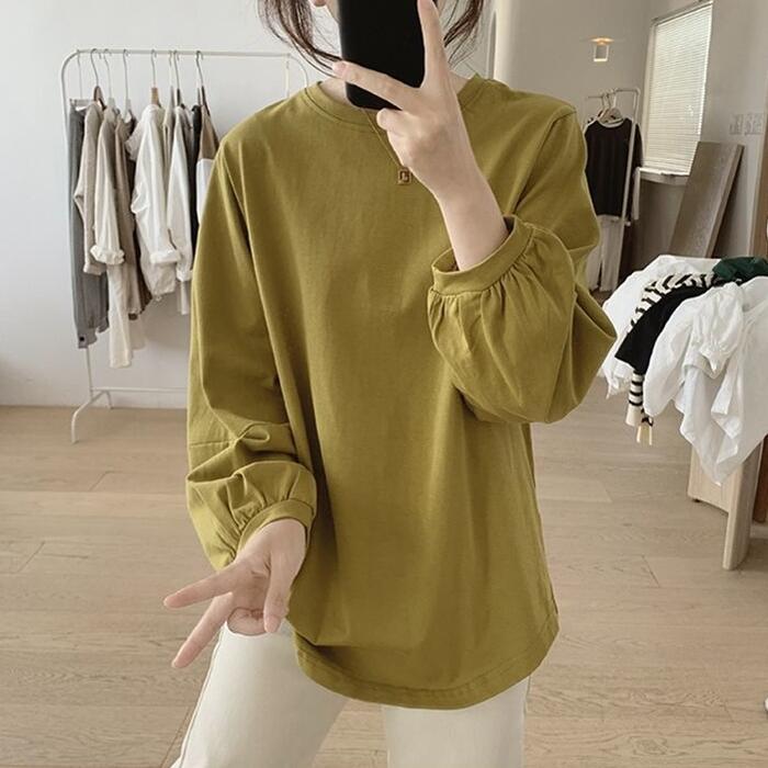 全3色 大きいサイズ 体型カバー おしゃれ 長袖 トップス Tシャツ カットソー プルオーバー ロンT パフスリーブ エレガント レディース 大人 可愛い きれいめ カジュアル フェミニン クルーネック シンプル ベーシック インナー イエロー ホワイト 白 ブラック 黒 春 秋 冬 20代 30代 40代 50代