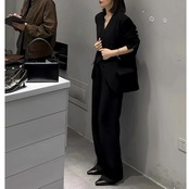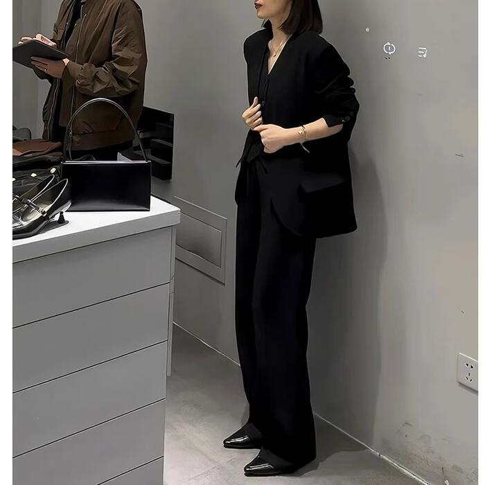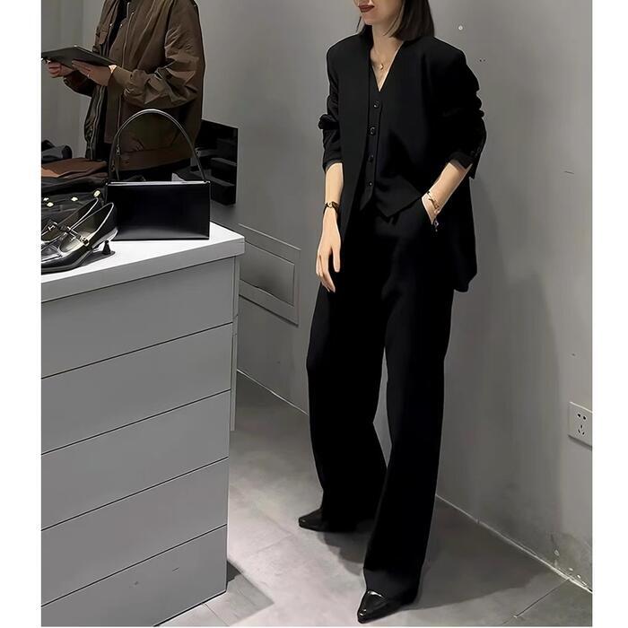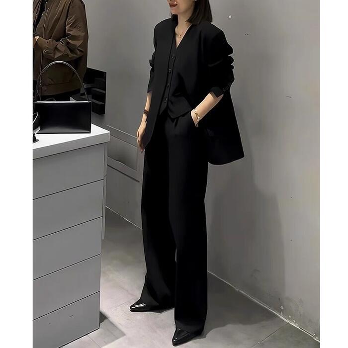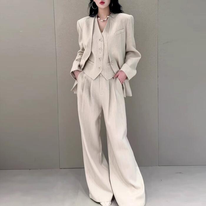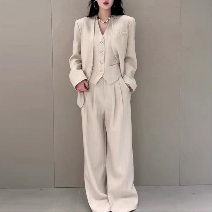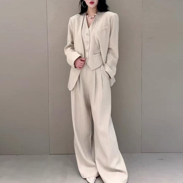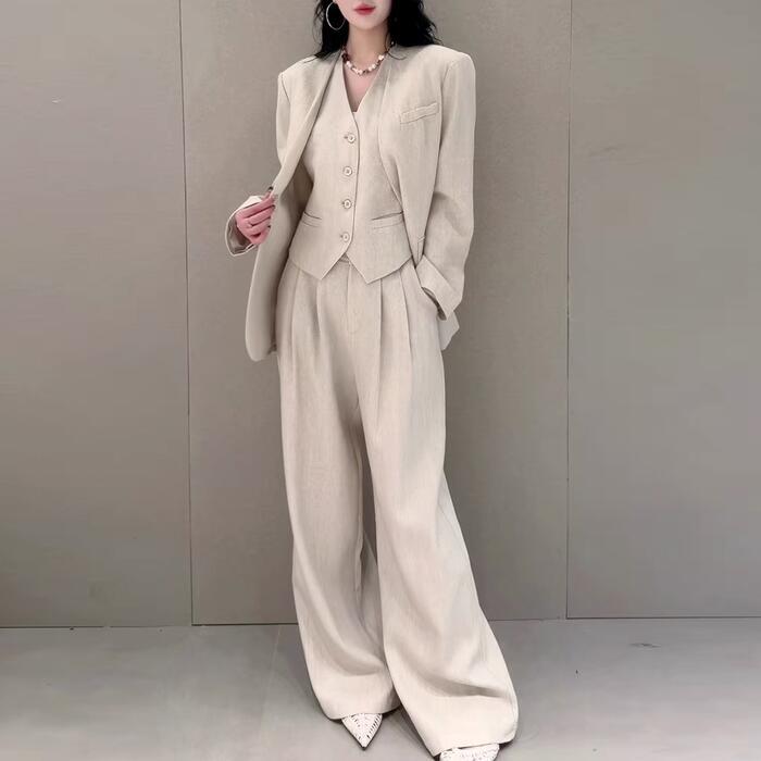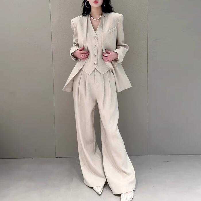 女性らしいモード感が素敵な、ジャケット、ベスト、パンツのスリーピースセットスーツ。