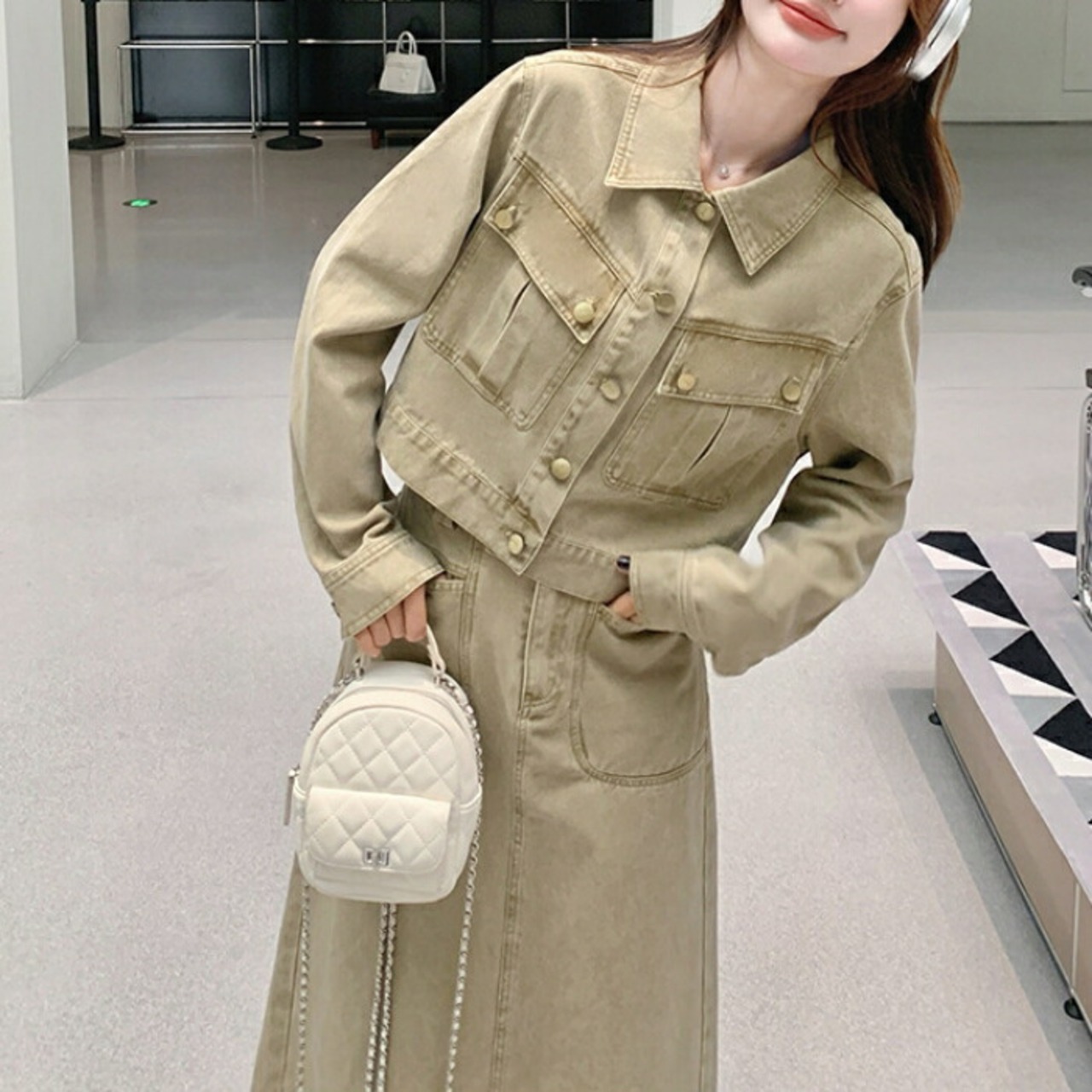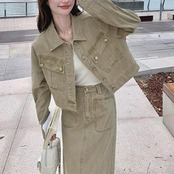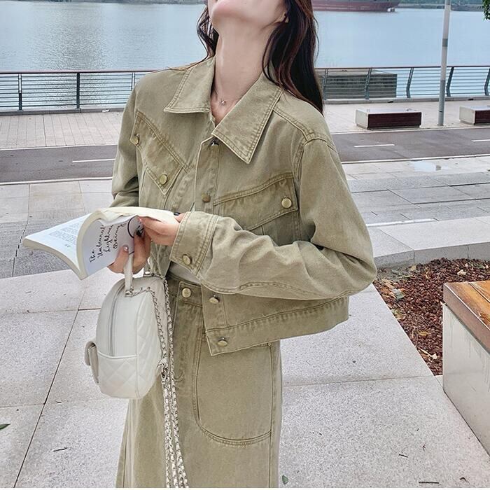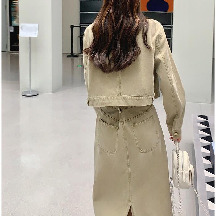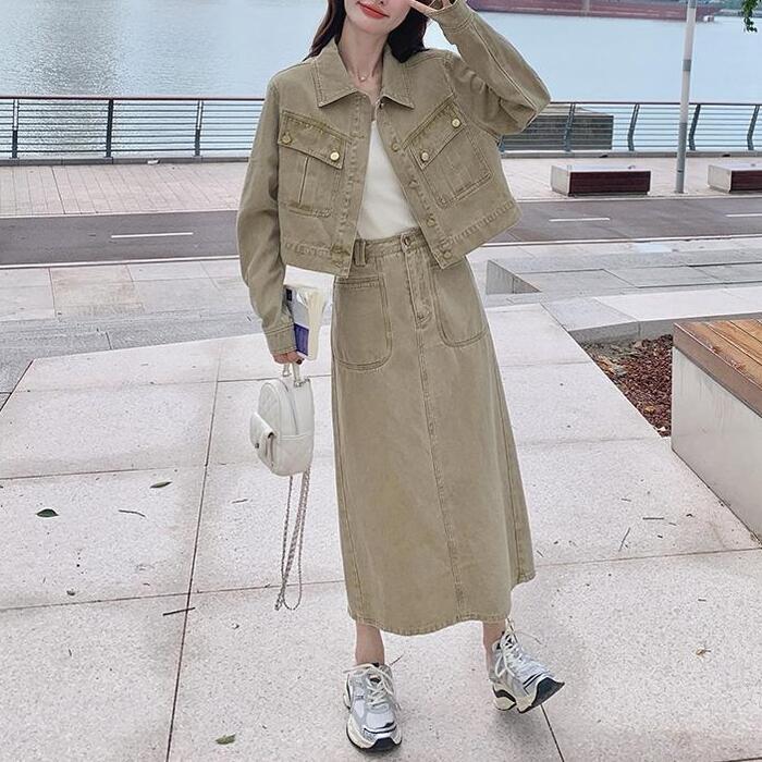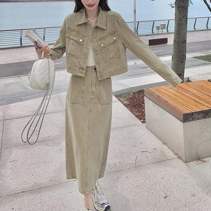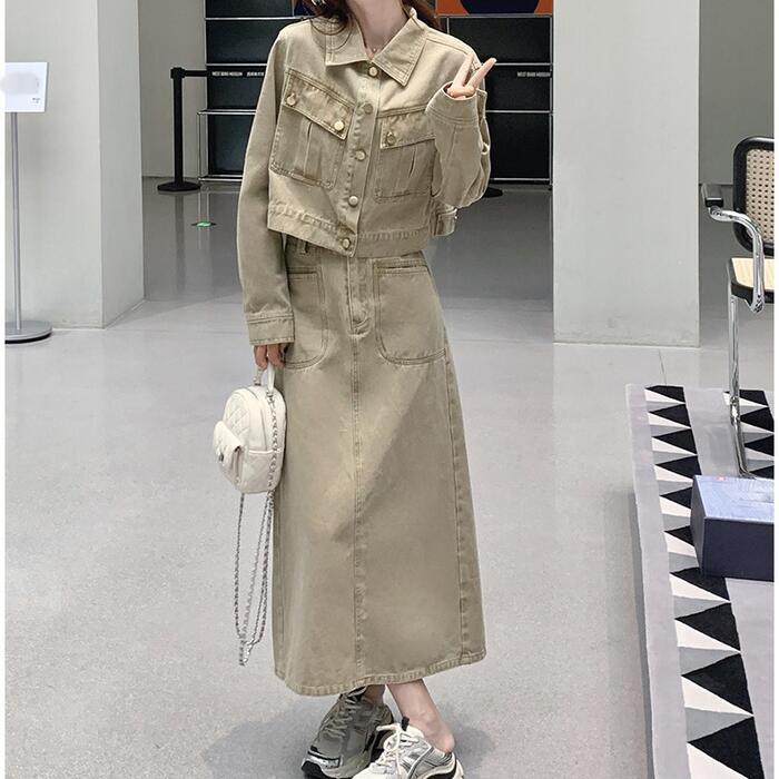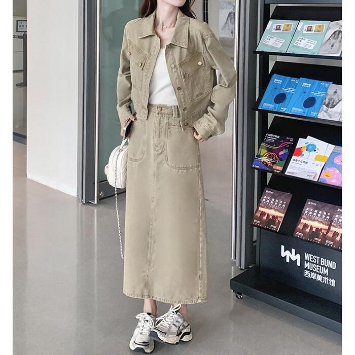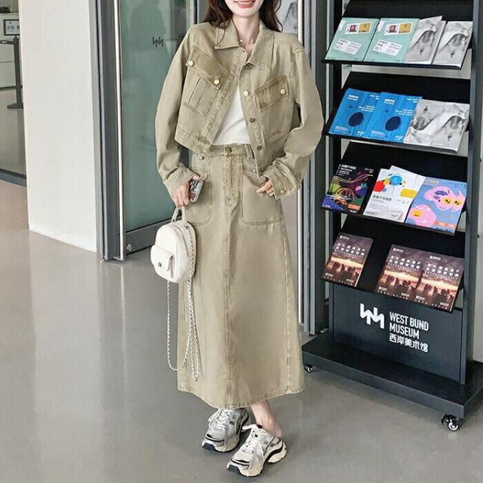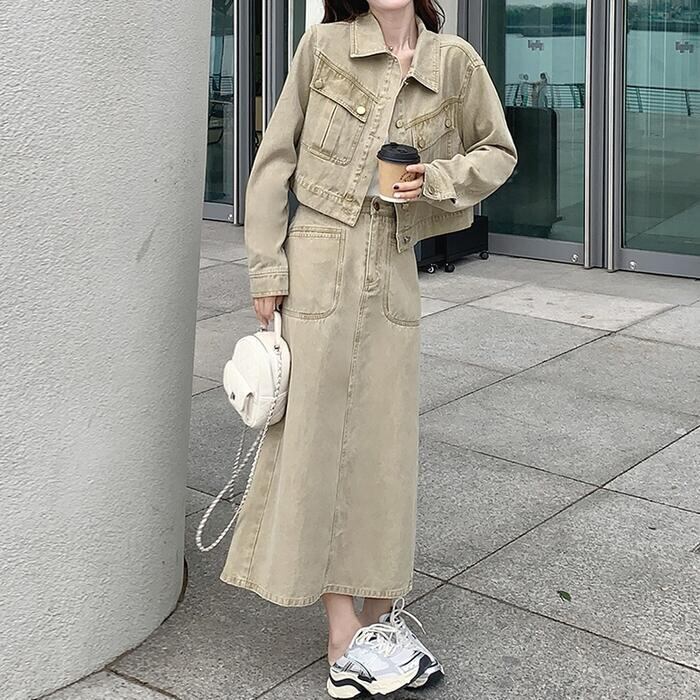 デニムジャケット&ロングスカートのセットアップ。
