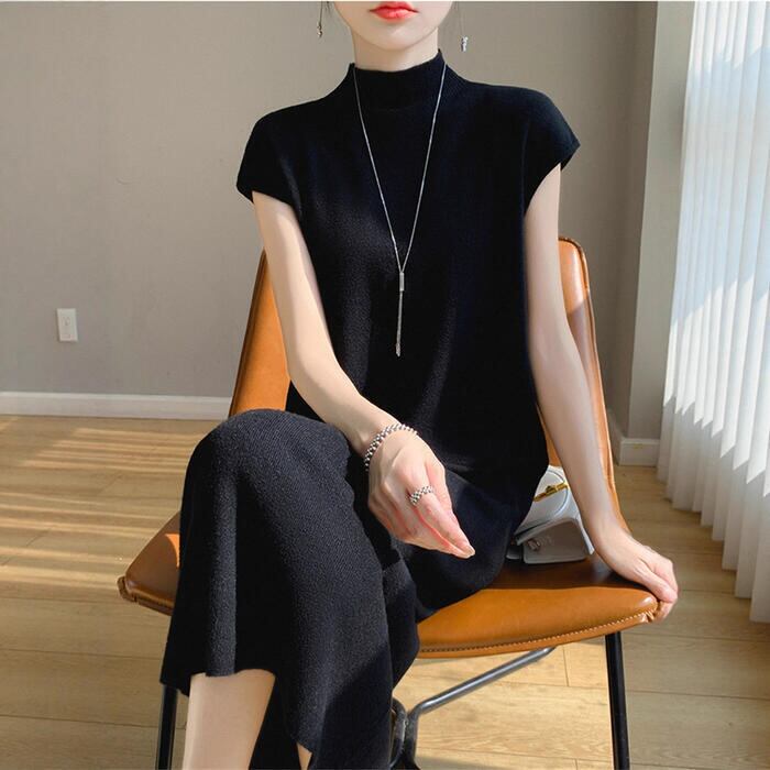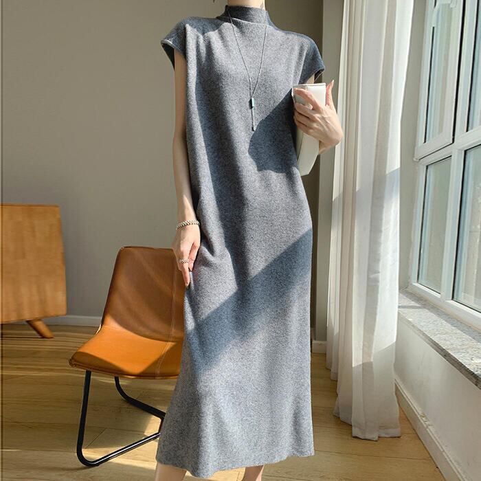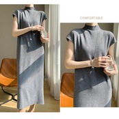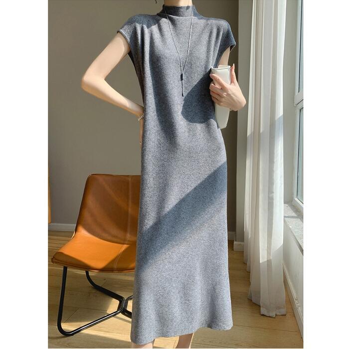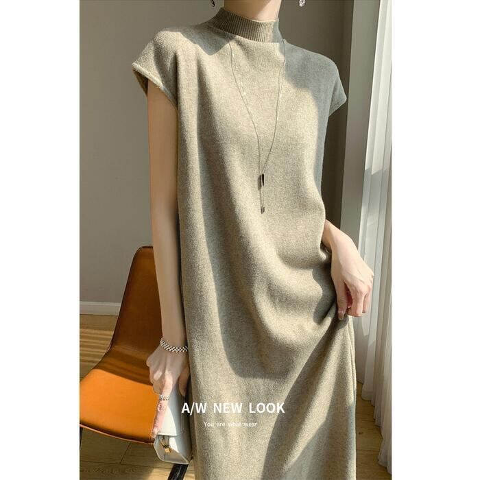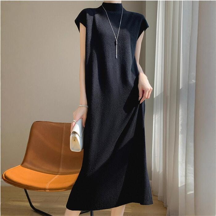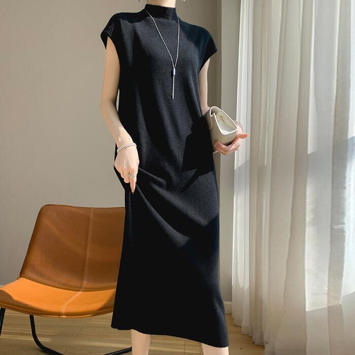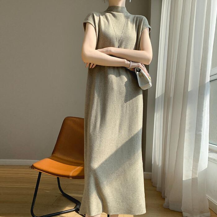 全3色 大きいサイズ 体型カバー スリム シンプル エレガント フェミニン シンプル おしゃれ 楽ちん ワンピース ワンピ ドレス レディース きれいめ カジュアル 大人可愛い 春 秋 冬 ニット 半袖 ハイネック モックネック ミモレ丈 ゆったり フレンチスリーブ ベージュ グレー ブラック 黒 20代 30代 40代 50代 M L XL 2XL