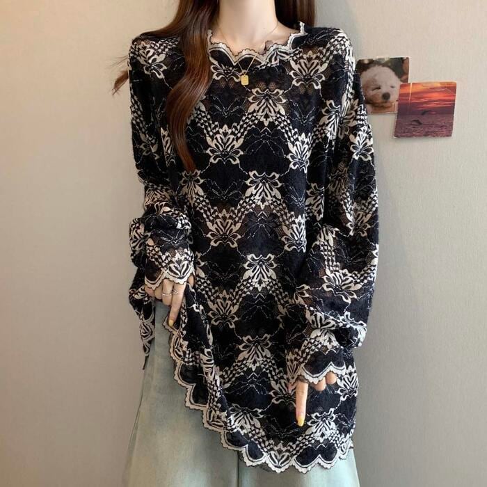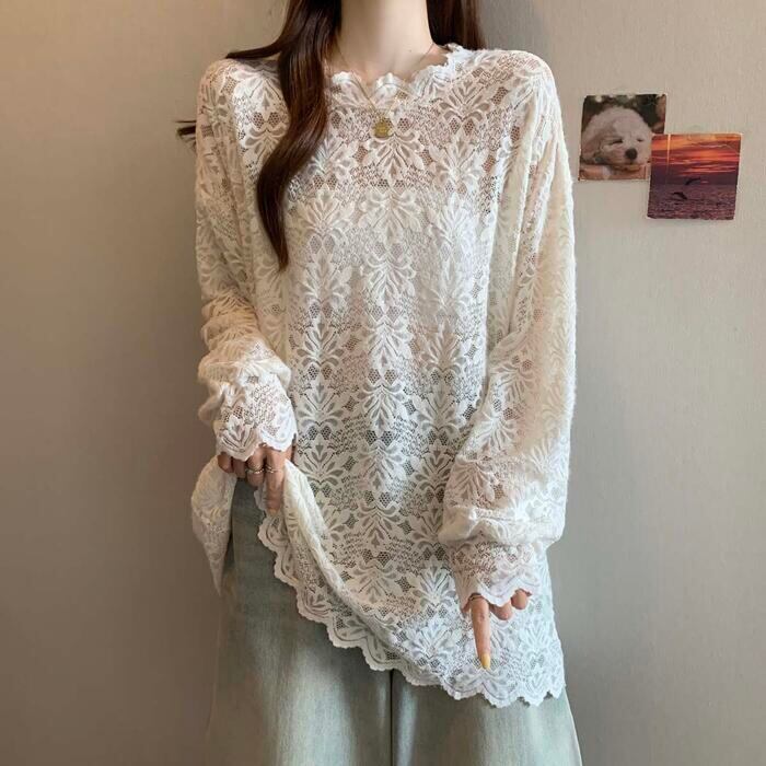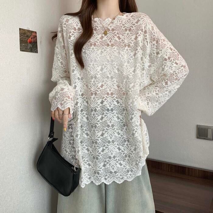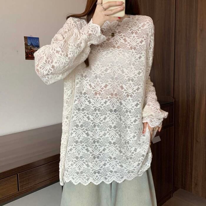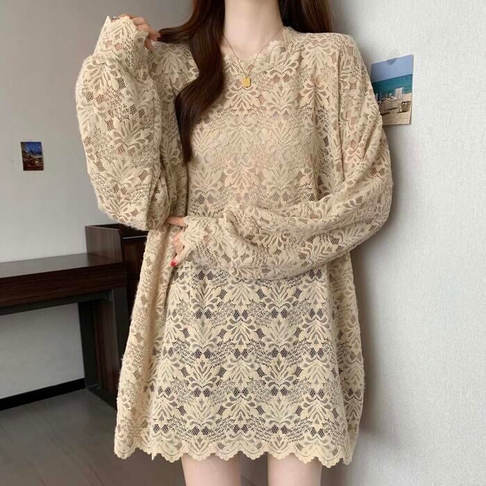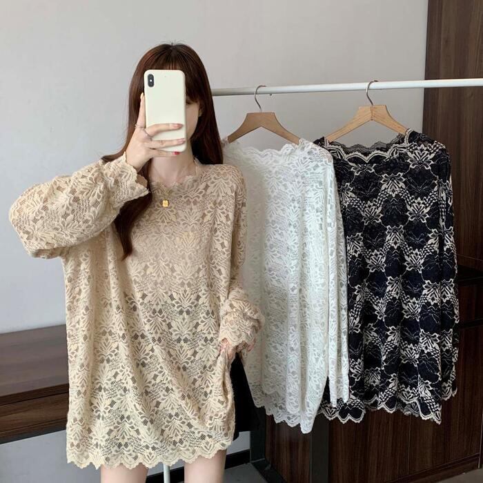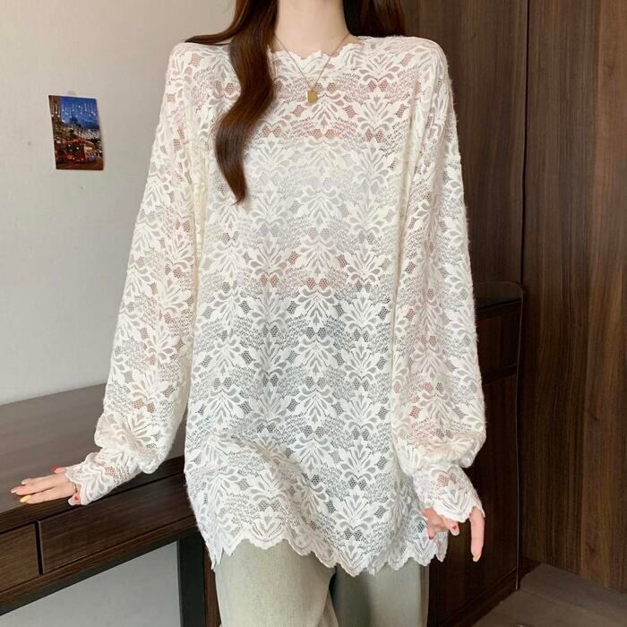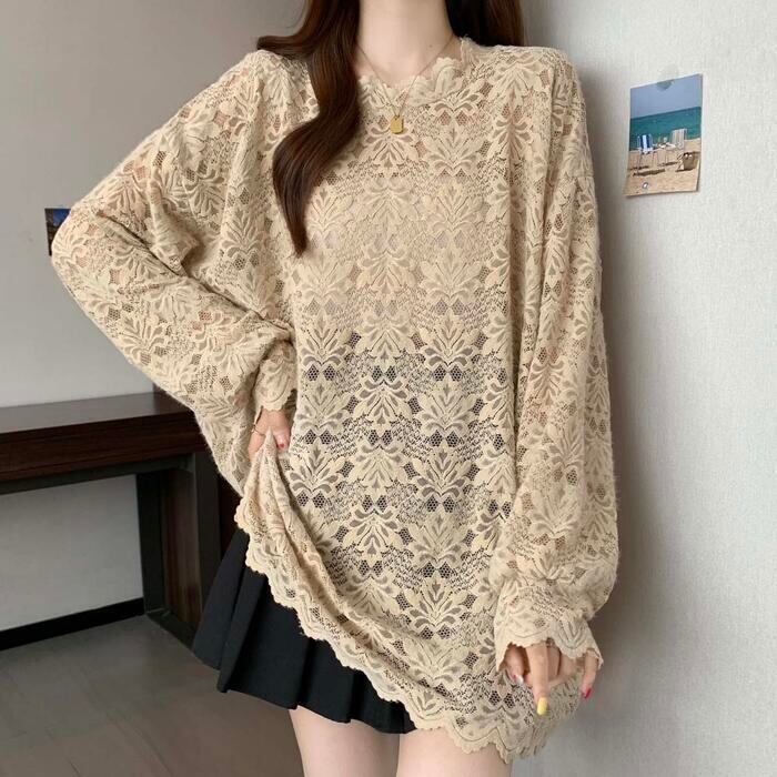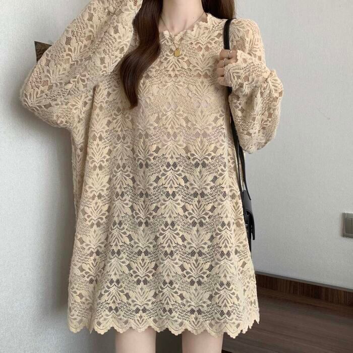 全3色 大きいサイズ 体型カバー エレガント フェミニン おしゃれ ナチュラル トップス ブラウス カットソー レディース きれいめ カジュアル 大人可愛い 春 夏 秋 冬 レース 長袖 透け感 シースルー Tシャツ ゆったり レイヤード ベージュ ブラック 黒 20代 30代 40代 50代 S M L XL