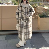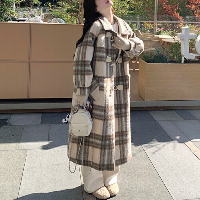 大人のフェミニンカジュアルスタイルになれるチェック柄ダッフルコート。
