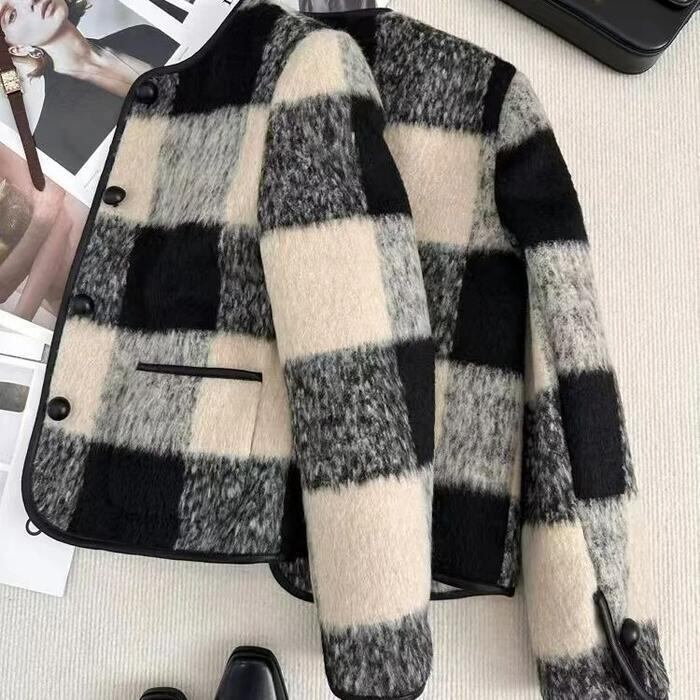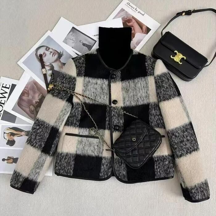 大きいサイズ 体型カバー フェミニン おしゃれ シンプル エレガント 上品 通勤 オフィス アウター コート ジャケット 羽織り レディース きれいめ カジュアル 大人可愛い 春 秋 冬 中綿 ノーカラー シャギー チェック柄 トラッド ショート丈 長袖 ブラック 黒 20代 30代 40代 50代 S M L XL 2XL