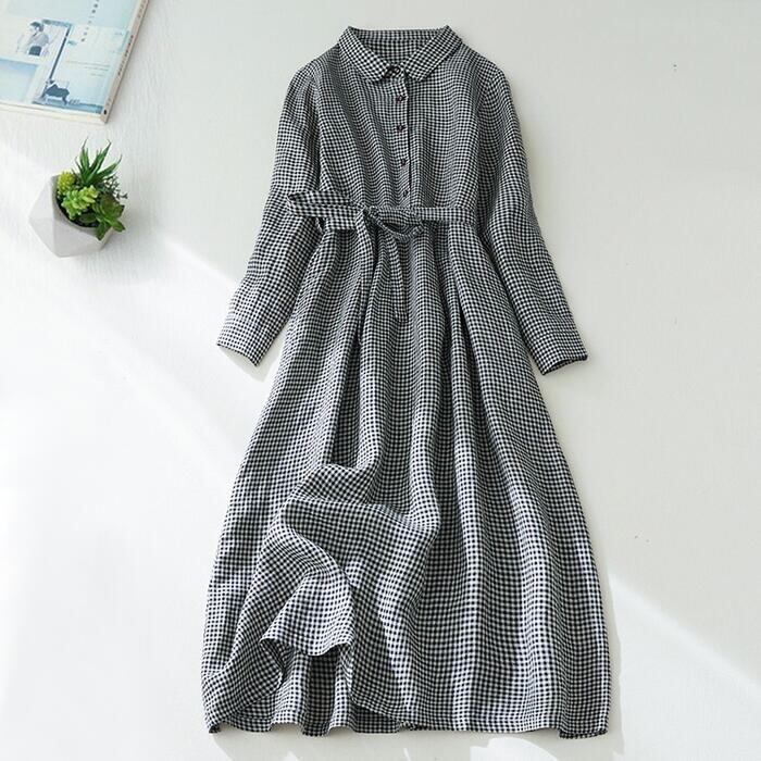 大きいサイズ 体型カバー エレガント フェミニン シンプル おしゃれ ワンピース ワンピ ドレス レディース きれいめ カジュアル 大人可愛い 春 秋 冬 ギンガムチェック シャツワンピ 綿麻 コットン リネン 長袖 ウエストリボン ロング丈 ブラック 黒 20代 30代 40代 50代 M L XL 2XL