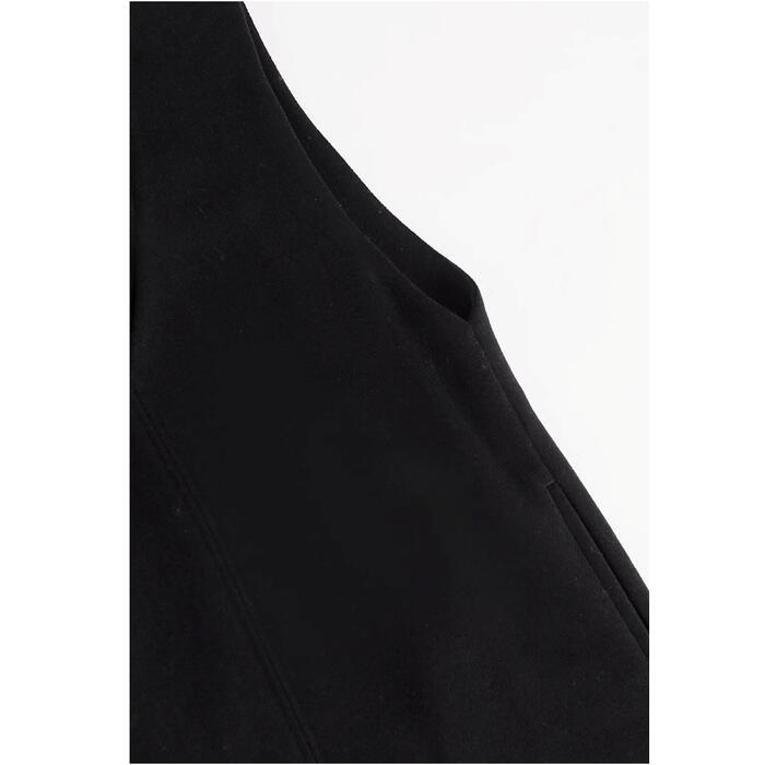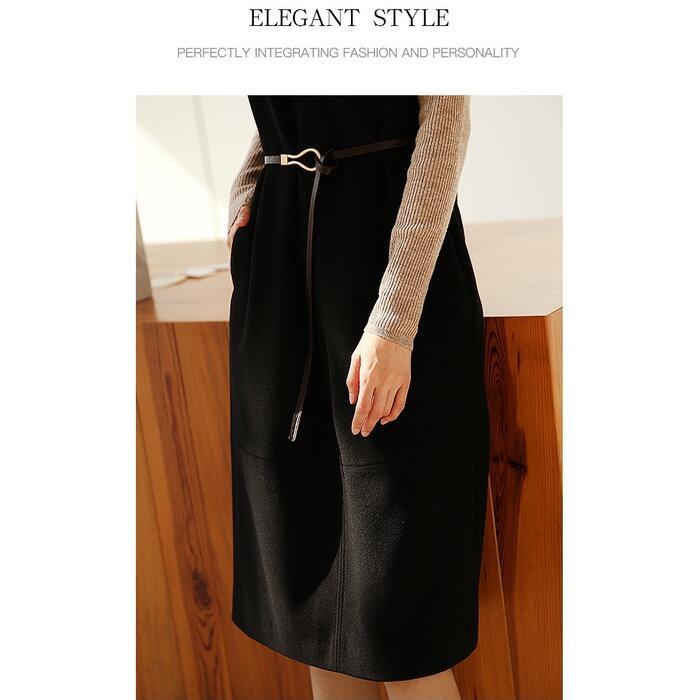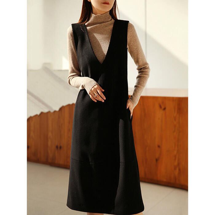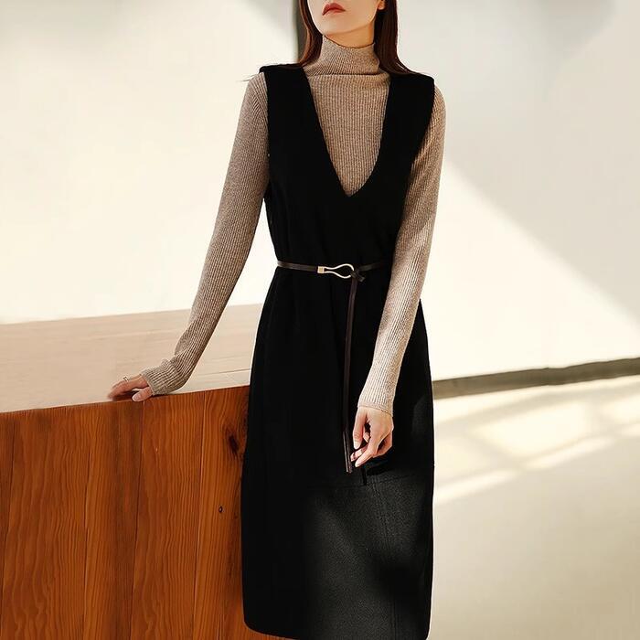 大きいサイズ 体型カバー エレガント フェミニン シンプル おしゃれ ワンピース ワンピ ドレス ジャンパースカート レディース きれいめ カジュアル 大人可愛い 春 秋 冬 ノースリーブ ミモレ丈 ウエストベルト レイヤード Vネック ブラック 黒 20代 30代 40代 50代 S M L XL