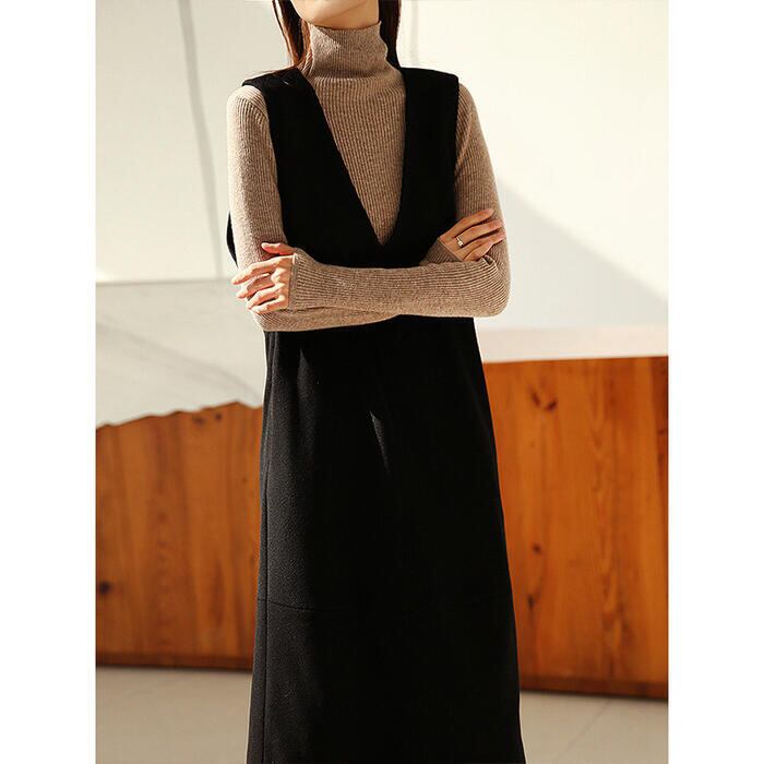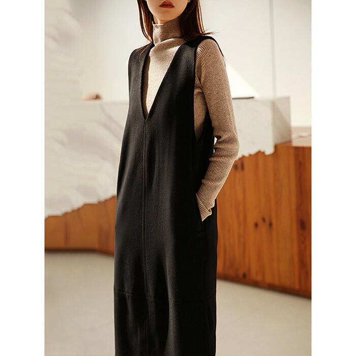 首元をすっきり演出してくれるVネックのジャンパースカート。