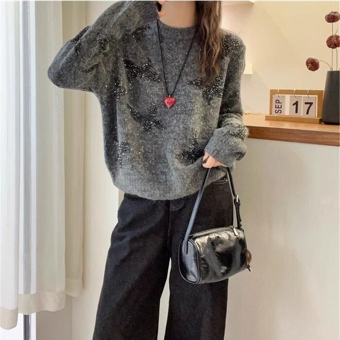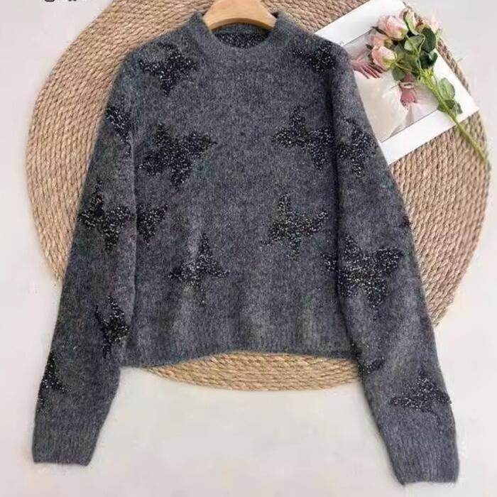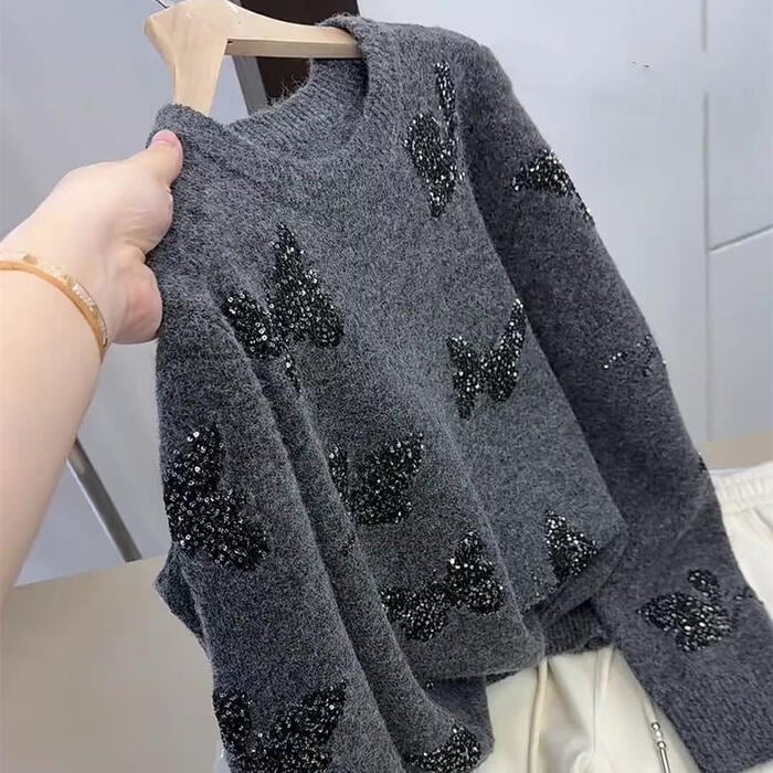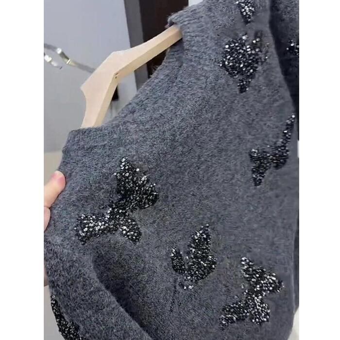 スパンコールのバタフライモチーフが目を惹くニットプルオーバー。