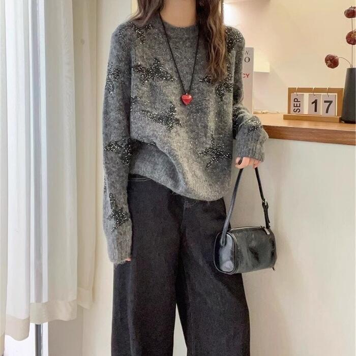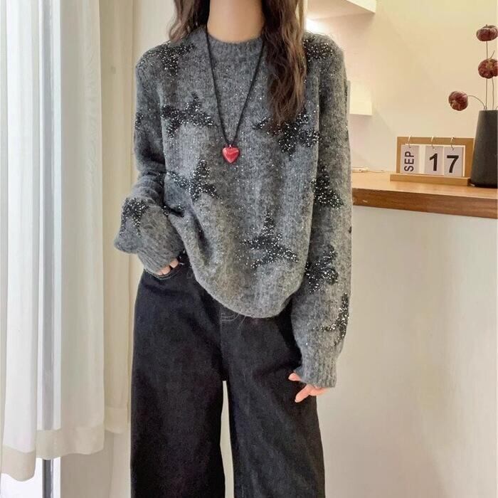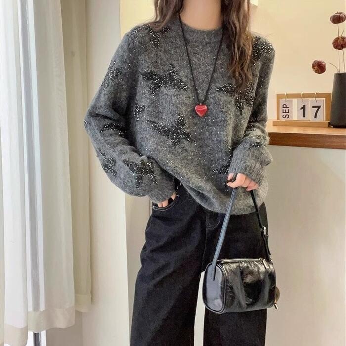 大きいサイズ 体型カバー エレガント フェミニン おしゃれ ナチュラル トップス ニット セーター レディース きれいめ カジュアル 大人可愛い 春 秋 冬 バタフライ 蝶々 スパンコール 長袖 クルーネック プルオーバー カットソー グレー 20代 30代 40代 50代 M L XL