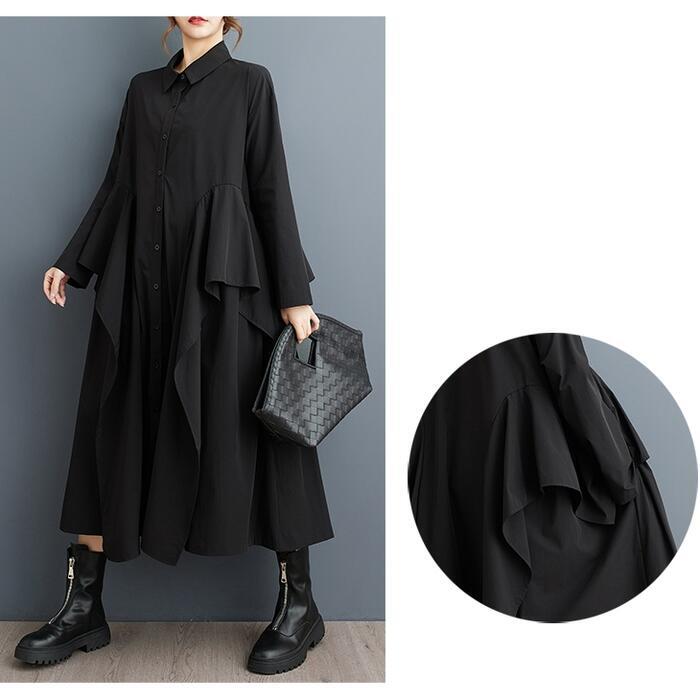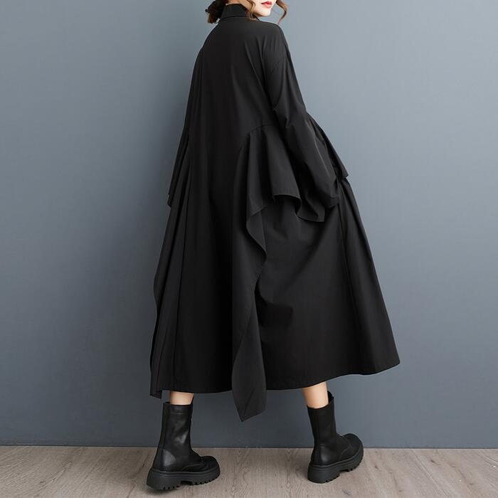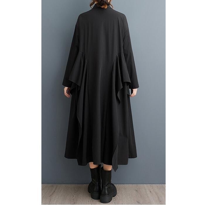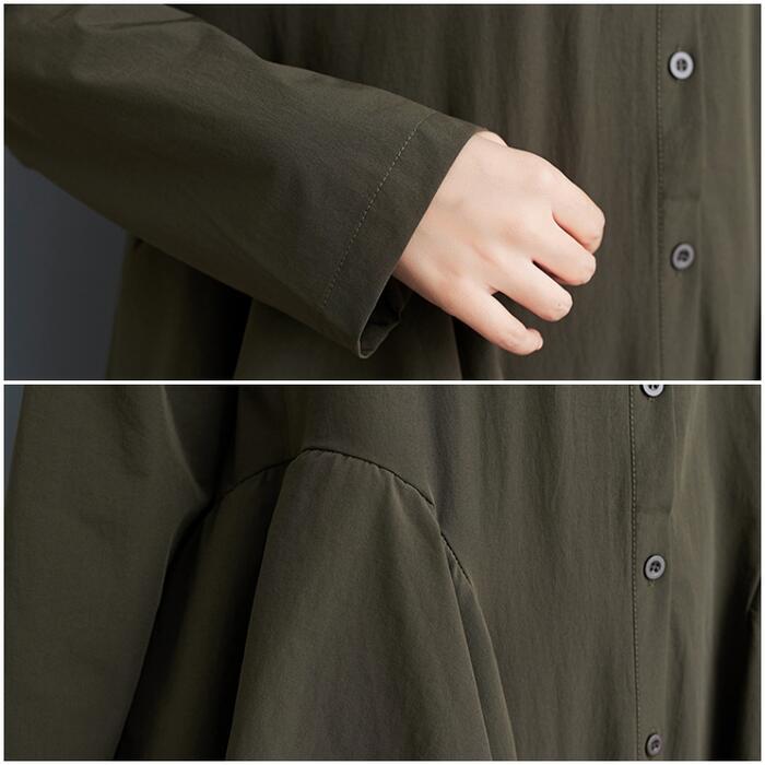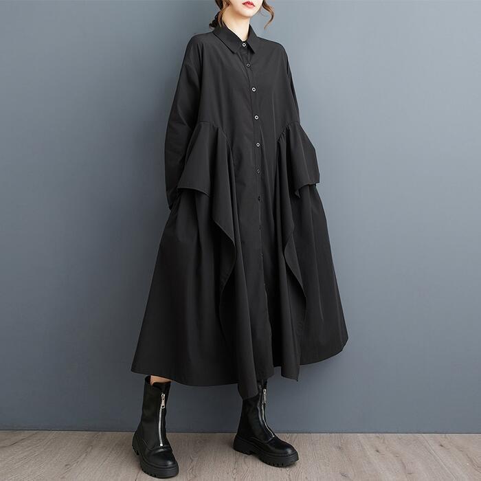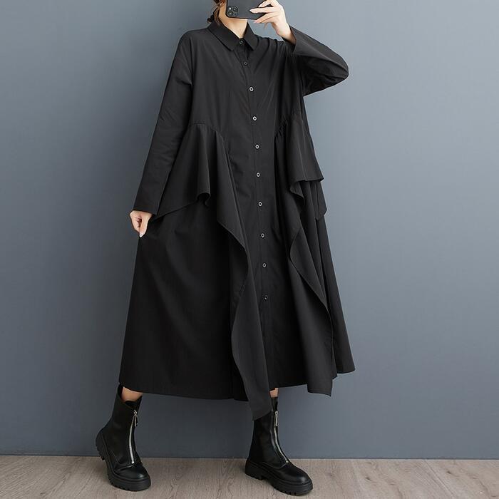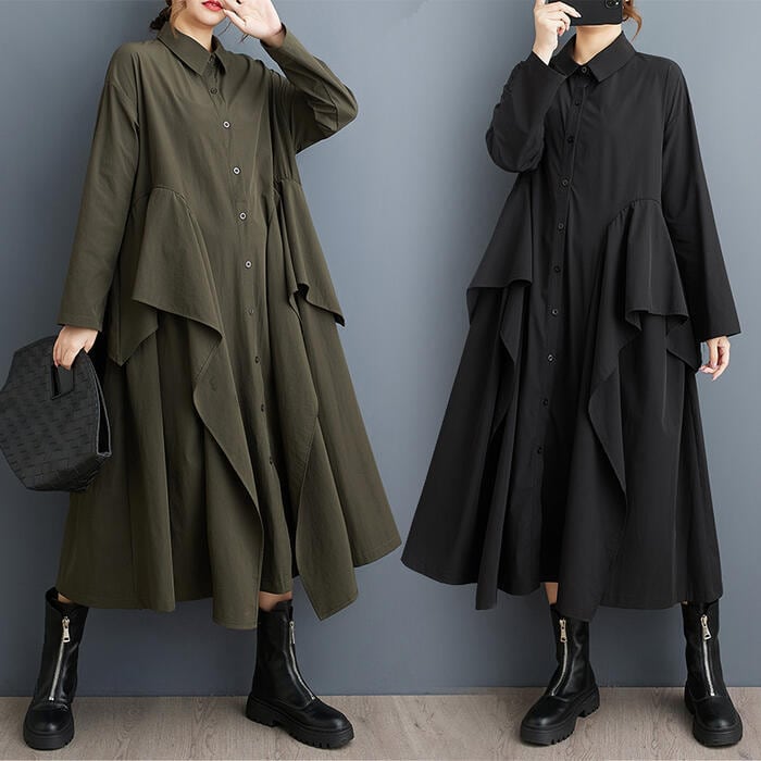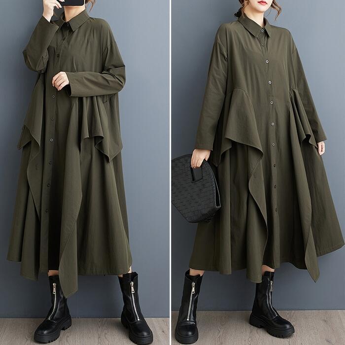 全2色 大きいサイズ 体型カバー エレガント フェミニン シンプル おしゃれ ワンピース ワンピ ドレス レディース きれいめ カジュアル 大人可愛い 春 秋 冬 長袖 シャツワンピ ミモレ丈 ラッフル フリル Aライン ゆったり 楽ちん グリーン 緑 ブラック 黒 20代 30代 40代 50代 フリー