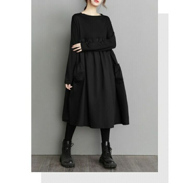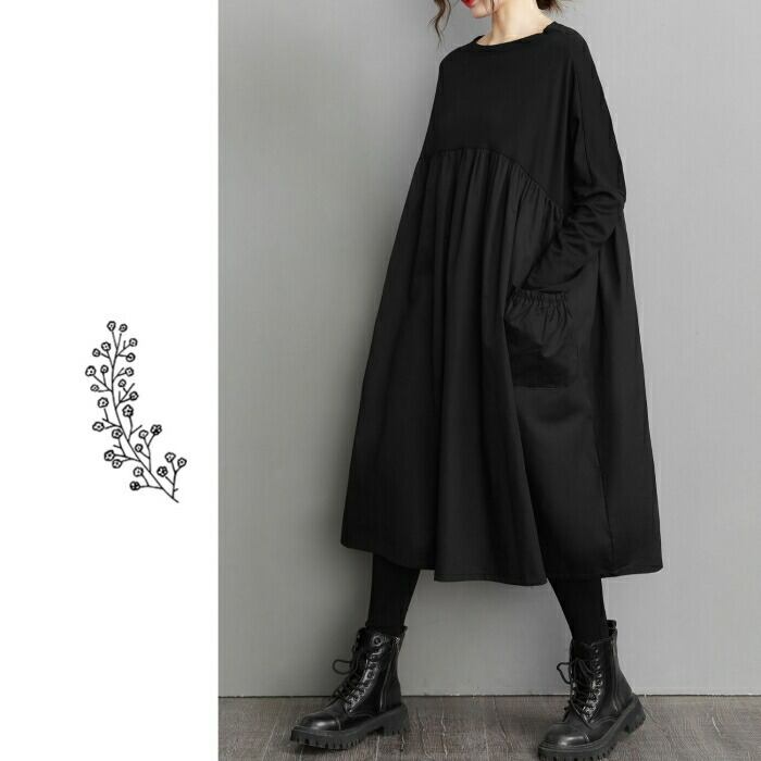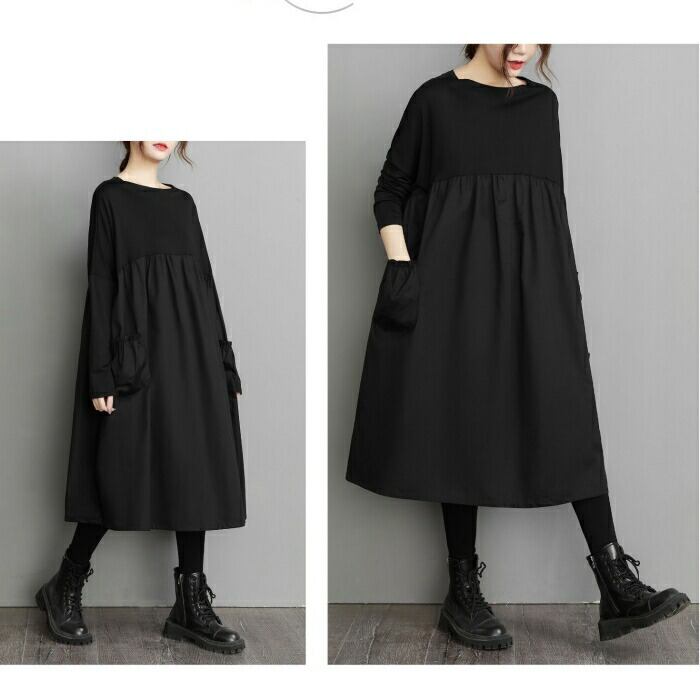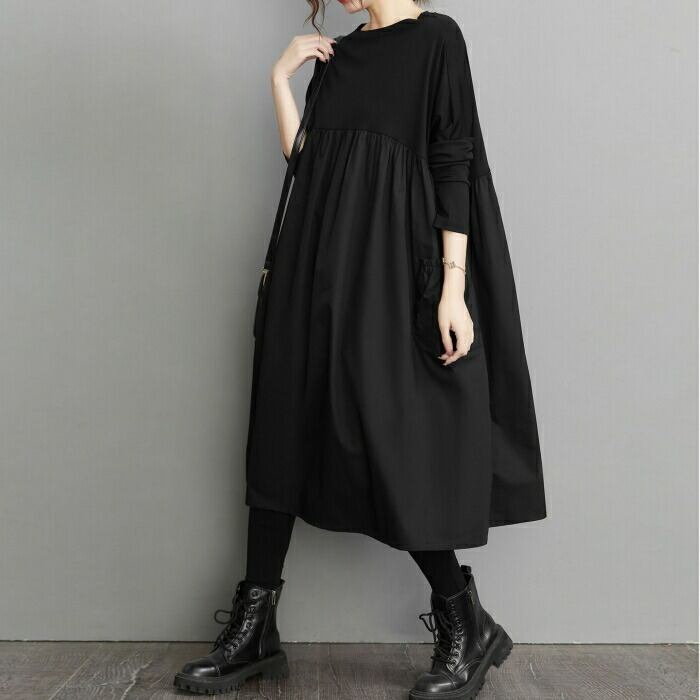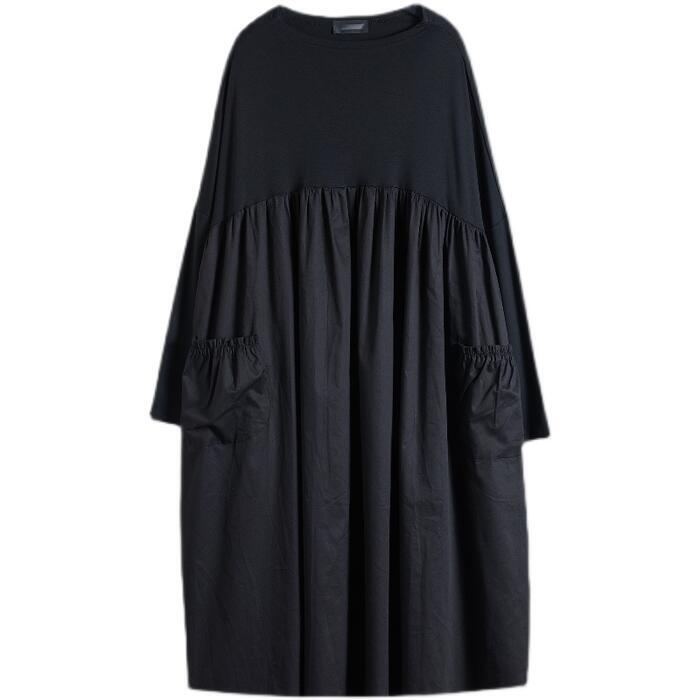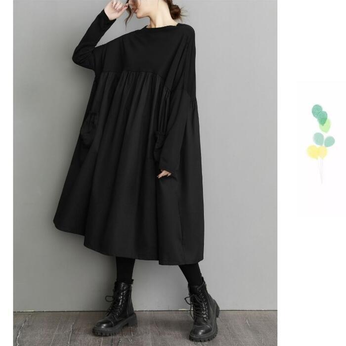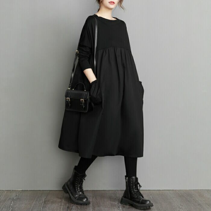 大きいサイズ 体型カバー エレガント フェミニン シンプル おしゃれ ワンピース ワンピ ドレス レディース きれいめ カジュアル 大人可愛い 春 秋 冬 長袖 切り替え 異素材ミックス ミモレ丈 Aライン ゆったり 楽ちん プルオーバー ブラック 黒 20代 30代 40代 50代 L XL