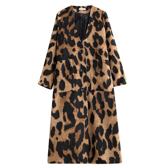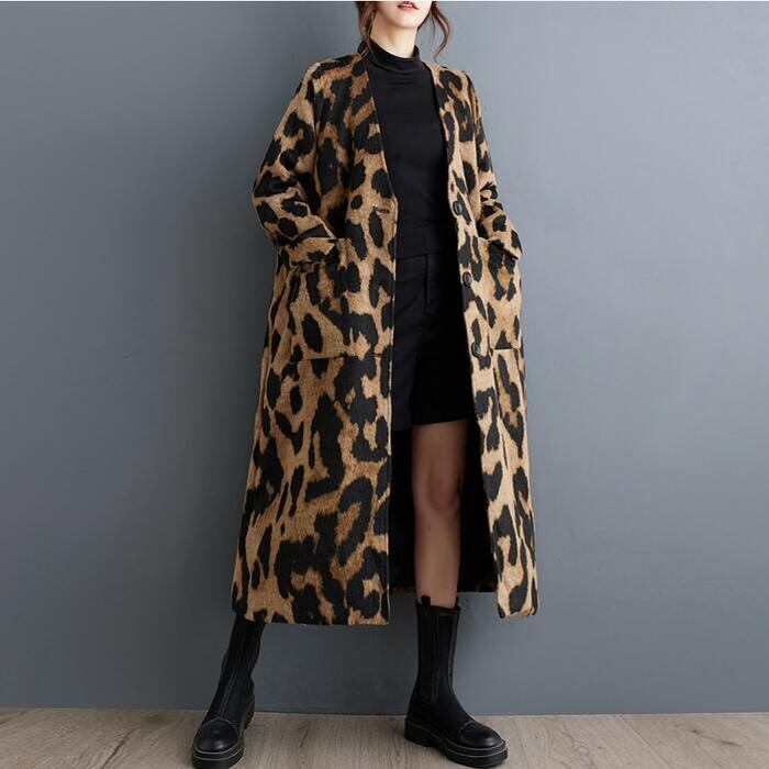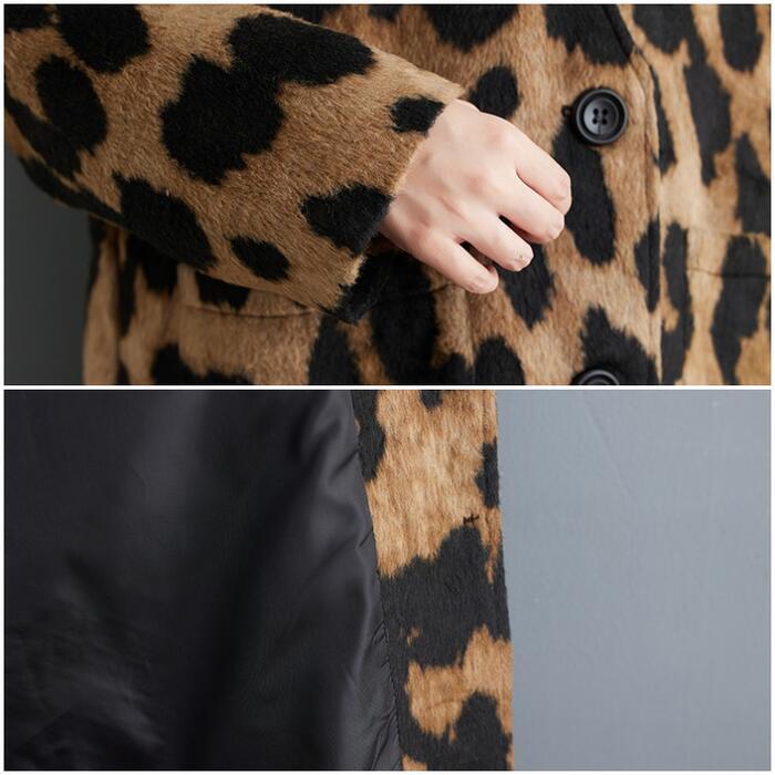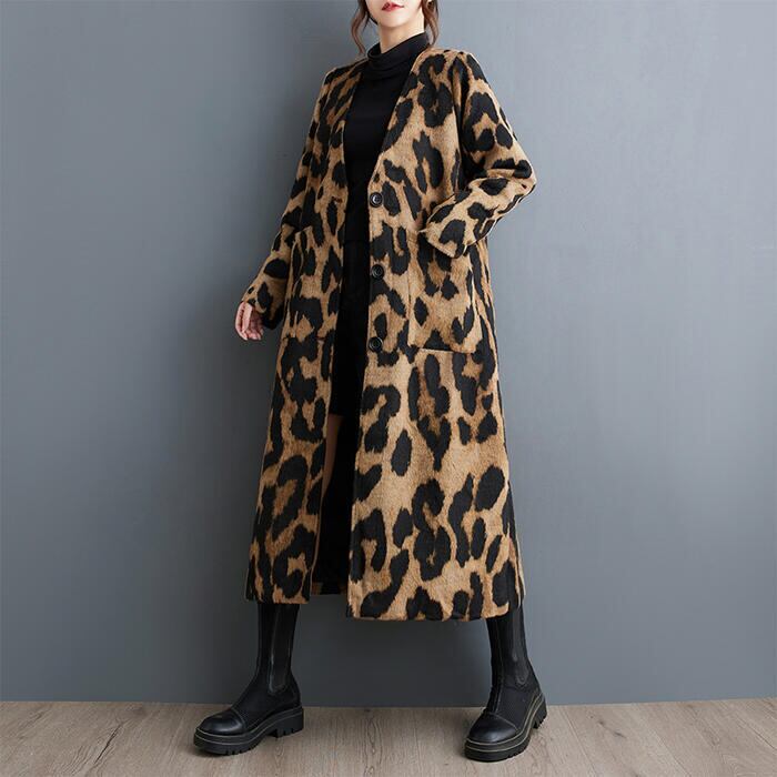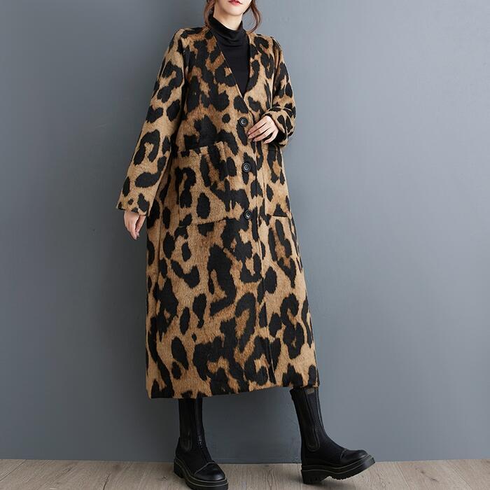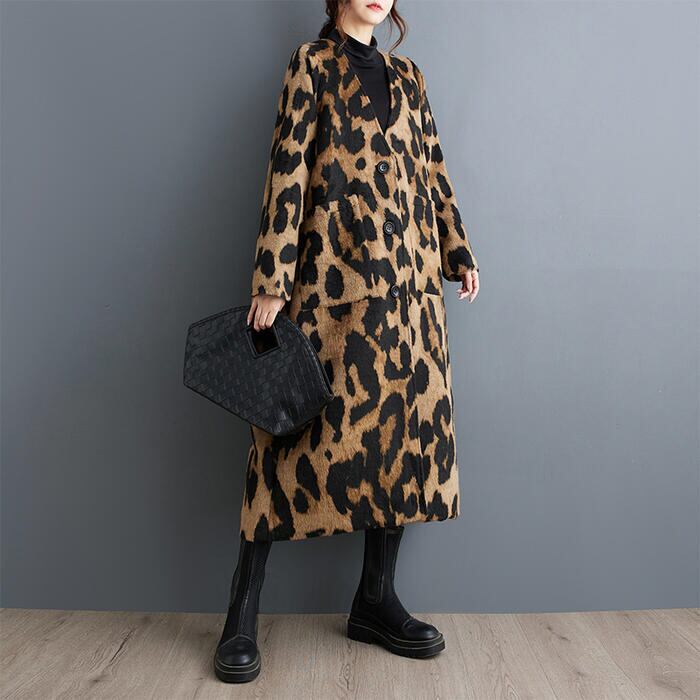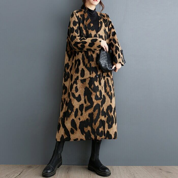 大きいサイズ 体型カバー エレガント フェミニン おしゃれ かっこいい アウター コート ジャケット レディース きれいめ カジュアル 大人可愛い 春 秋 冬 羽織り 長袖 ヒョウ柄 レオパード Vネック Aライン ノーカラー ゆったり アニマル柄 ブラウン 20代 30代 40代 50代 フリー