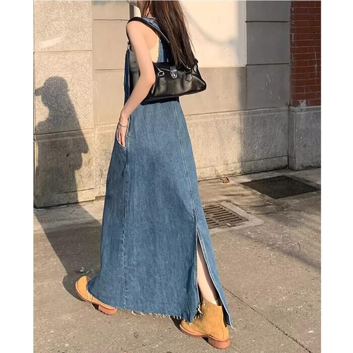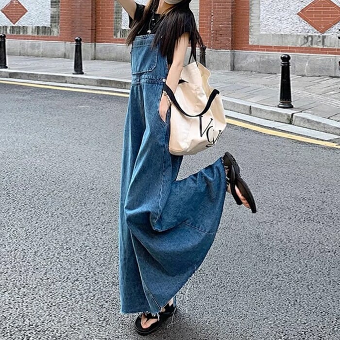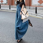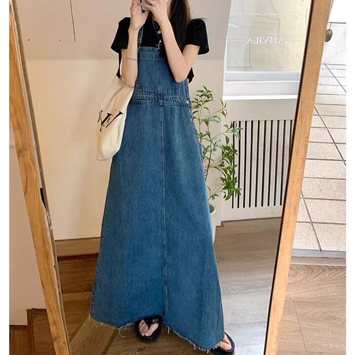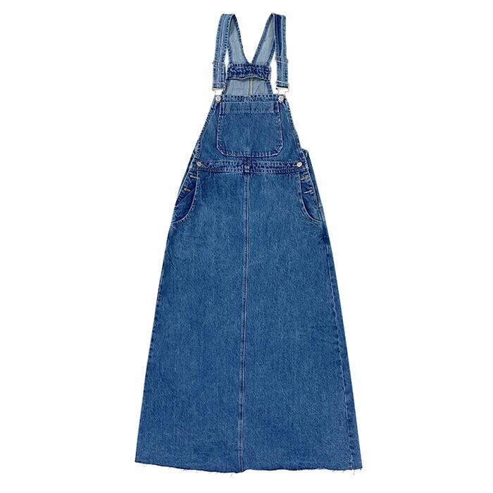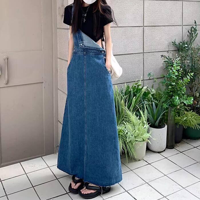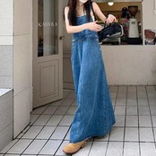 シンプルベーシックなシルエットのロングデニムサロペットスカート。