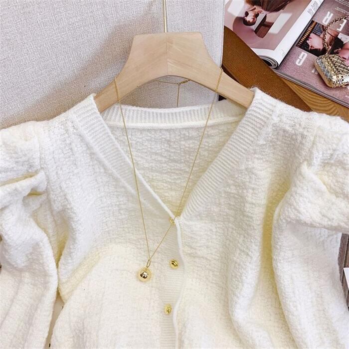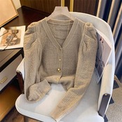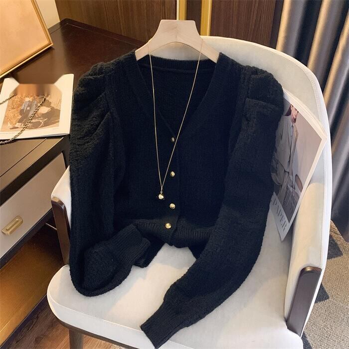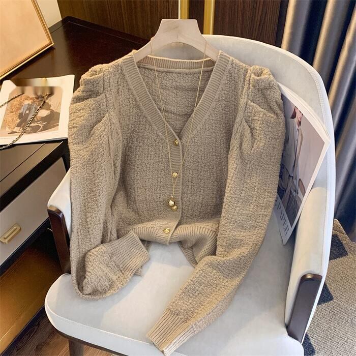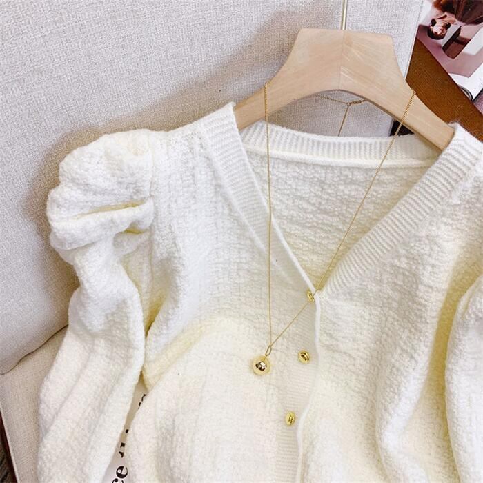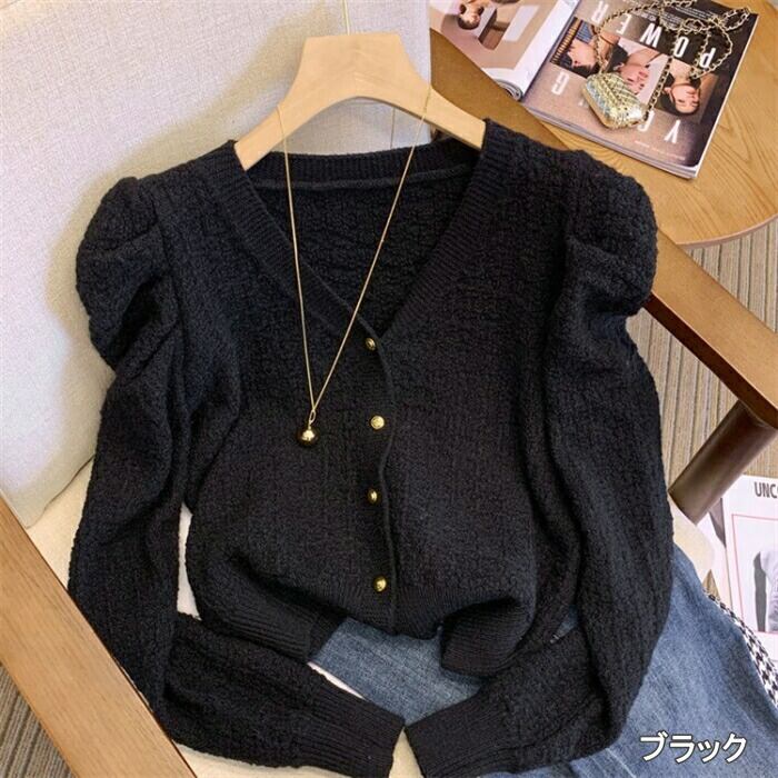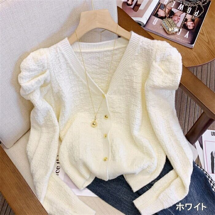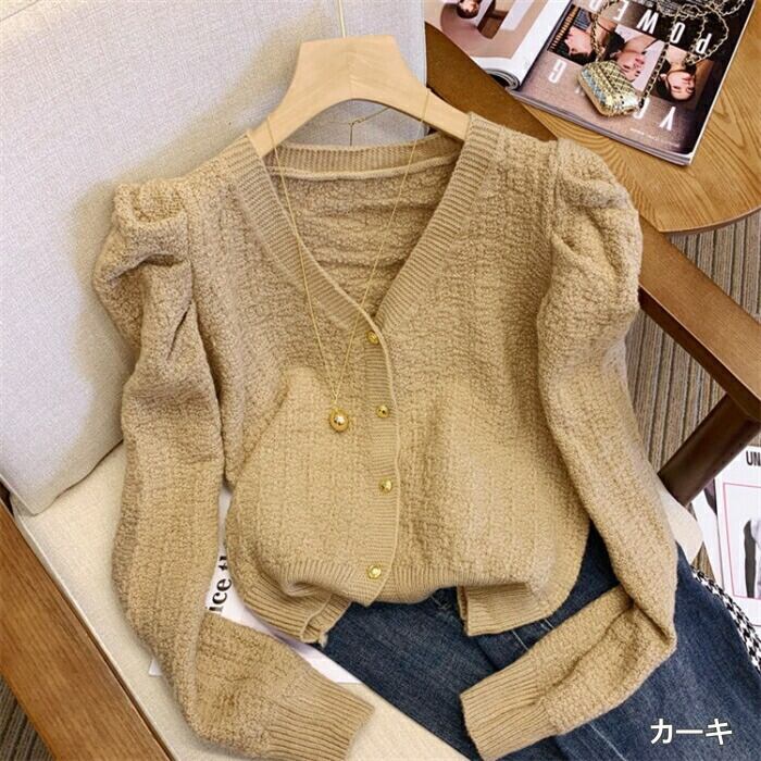 ギャザーで寄せたスリーブがポイントのニットカーディガン。