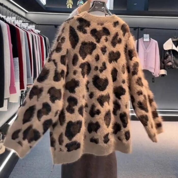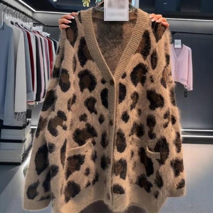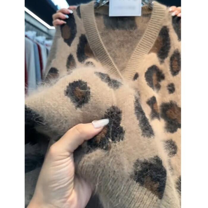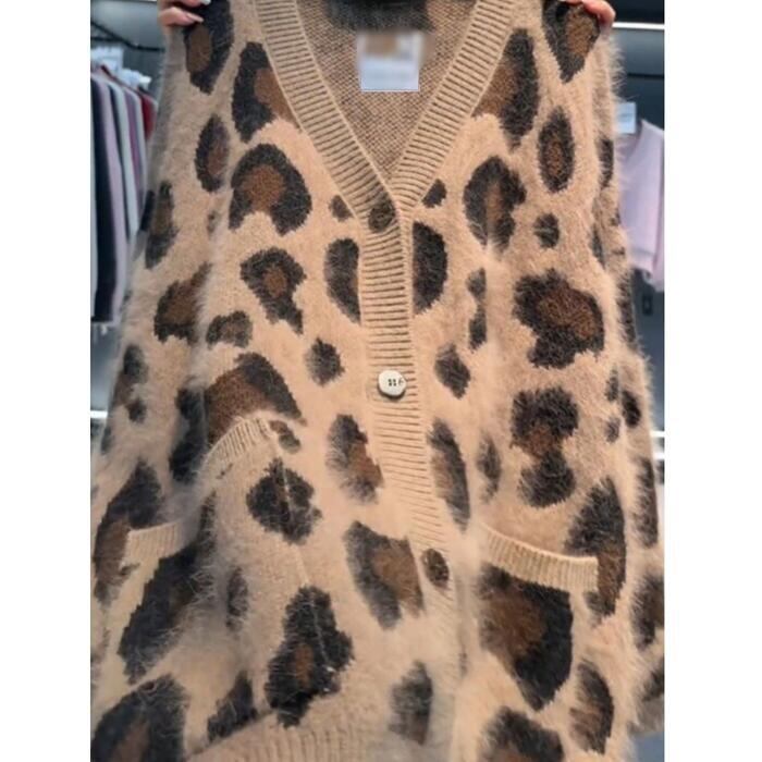 大きいサイズ 体型カバー エレガント フェミニン おしゃれ 韓国 トップス ニット カーディガン セーター レディース きれいめ カジュアル 大人可愛い 春 秋 冬 長袖 アニマル柄 ヒョウ柄 レオパード シャギー Vネック ゆったり ベージュ 20代 30代 40代 50代 M L XL