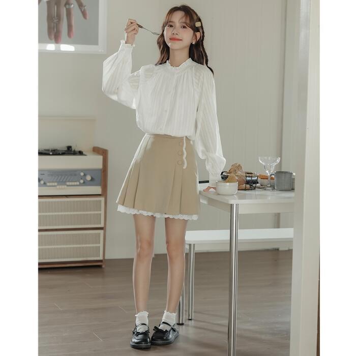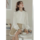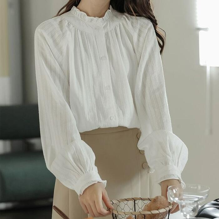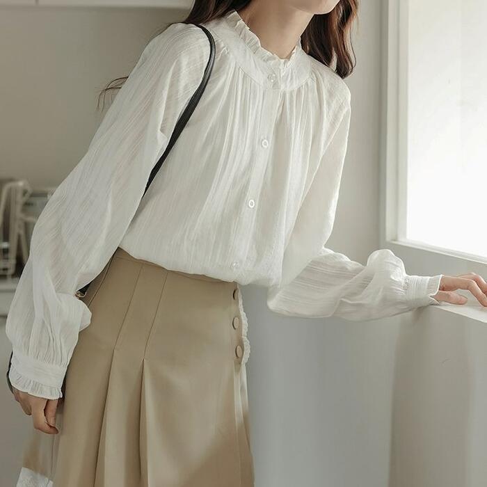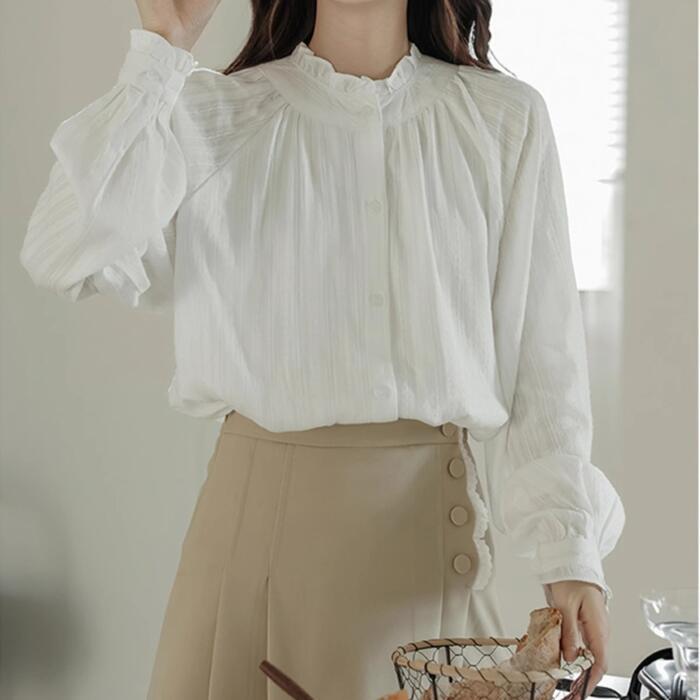 首元のフリルがクラシカルな雰囲気のブラウス。