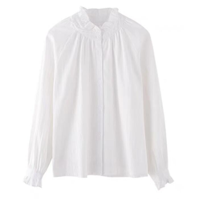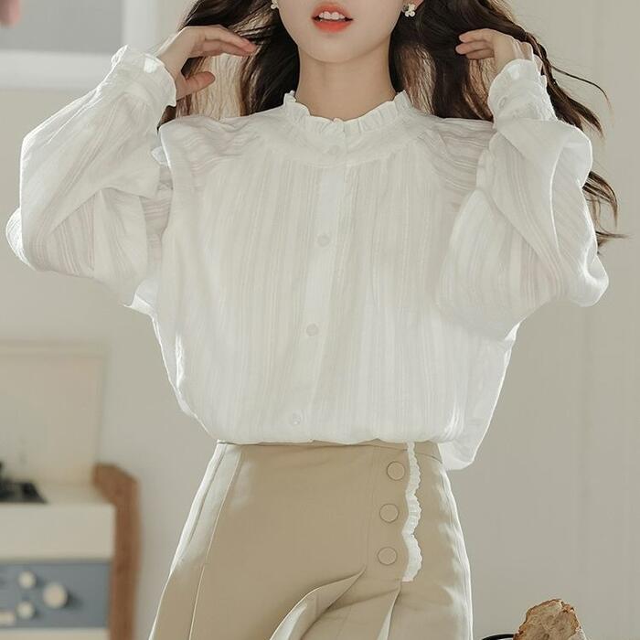 全2種 大きいサイズ 体型カバー エレガント フェミニン おしゃれ ナチュラル トップス ブラウス シャツ レディース きれいめ カジュアル 大人可愛い 春 秋 冬 長袖 フリル 裏起毛 スタンドカラー クラシカル ホワイト 白 20代 30代 40代 50代 S M L XL 2XL