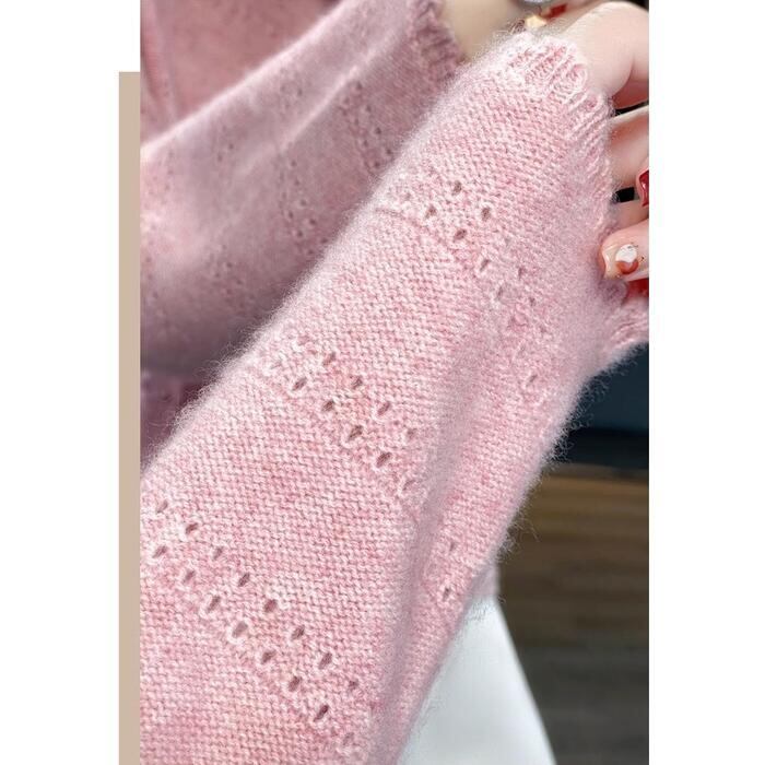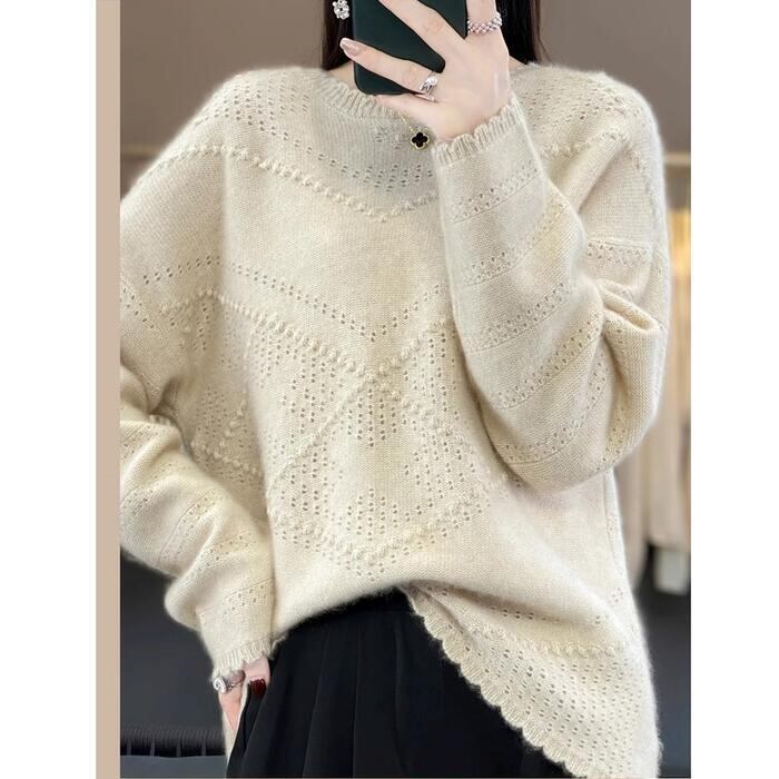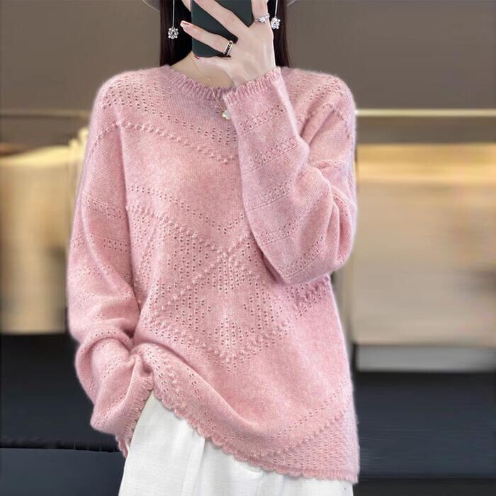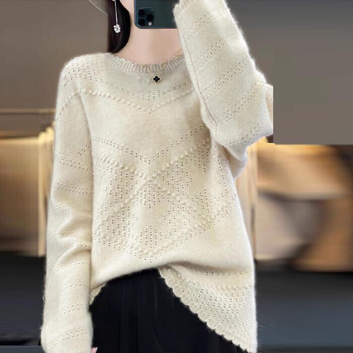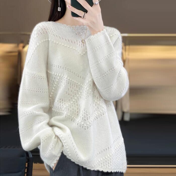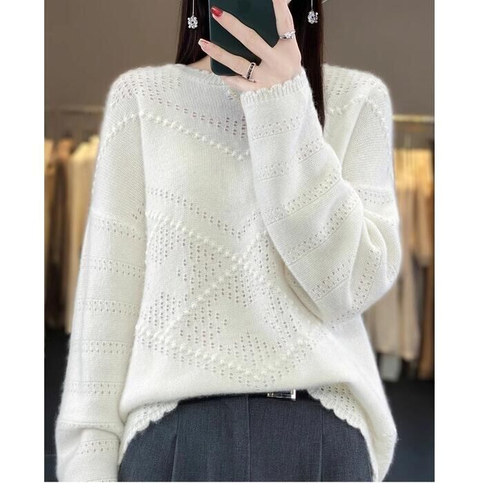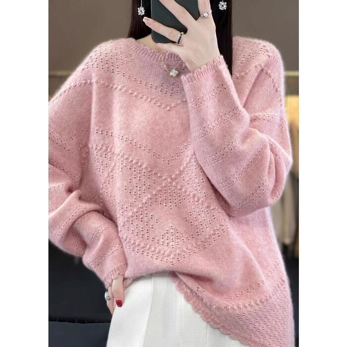 全3色 大きいサイズ 体型カバー エレガント フェミニン おしゃれ ナチュラル シンプル トップス ニット セーター レディース きれいめ カジュアル 大人可愛い 春 秋 冬 透かし編み 長袖 ウール混 ゆったり ベージュ ホワイト 白 ピンク 20代 30代 40代 50代 M L XL 2XL 3XL 4XL 5XL
