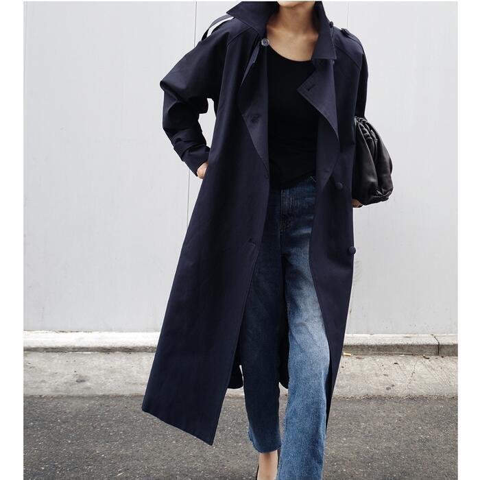 全2色 大きいサイズ 体型カバー フェミニン おしゃれ シンプル 通勤 オフィス アウター コート ジャケット トレンチ レディース きれいめ カジュアル 大人可愛い 春 秋 冬 ロング丈 トラッド 長袖 アシンメトリー ウエストベルト ベージュ ネイビー 20代 30代 40代 50代 S M L XL
