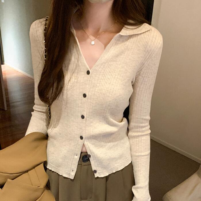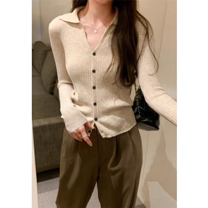 全4色 大きいサイズ 体型カバー エレガント フェミニン おしゃれ ナチュラル シンプル トップス ニット カットソー Tシャツ カーディガン レディース きれいめ カジュアル 大人可愛い 春 秋 冬 長袖 Vネック 襟付き リブ タイト ブルー 青 ベージュ グレー ブラック 黒 20代 30代 40代 50代 S M L