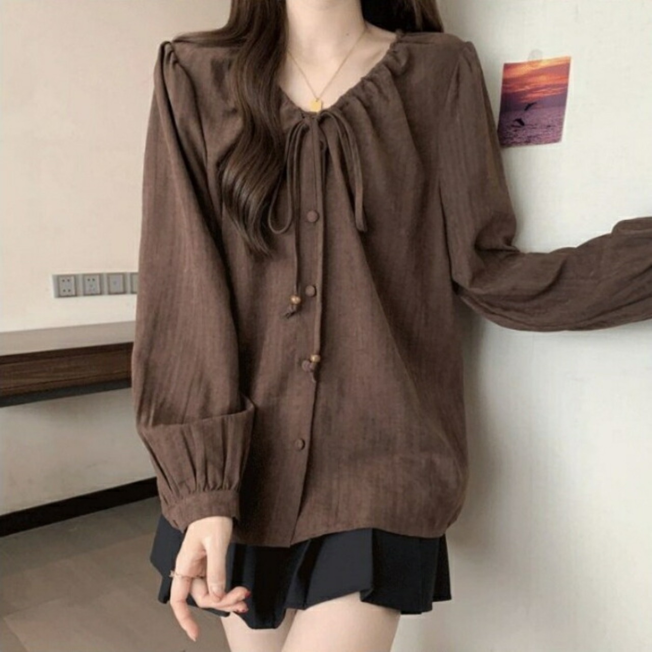 首元のリボンが大人可愛いポイントになった長袖シャツ。