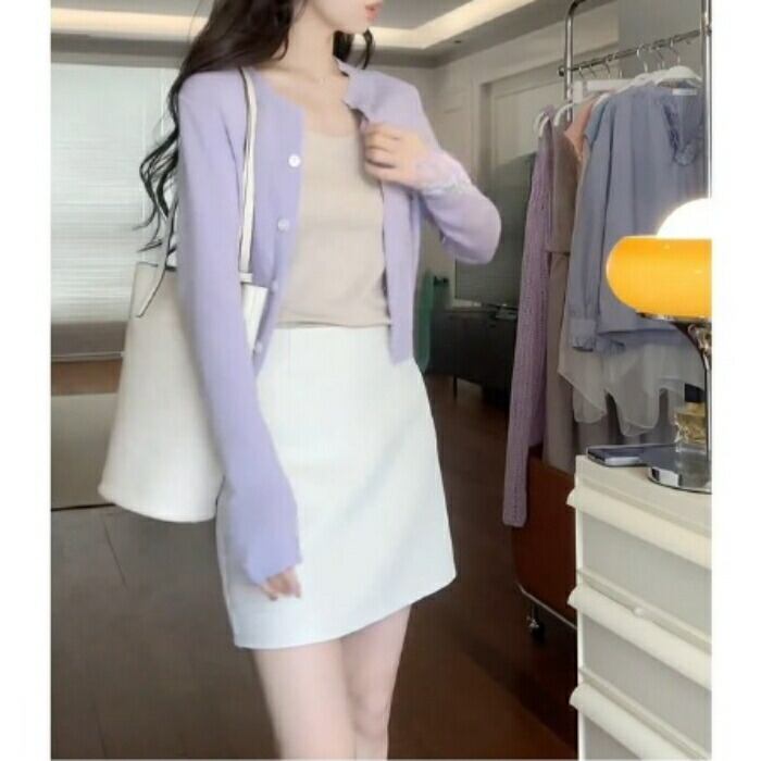 新鮮なコーデにしてくれる綺麗なパープルのカーディガン。