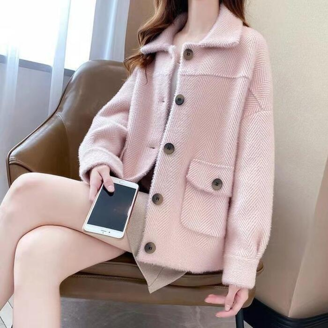 上品なヘリンボーン柄のショートジャケット。