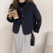 暖かさと上品さを兼ね備えたクラシカルなノーカラージャケット。