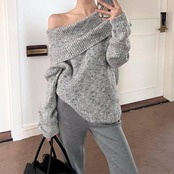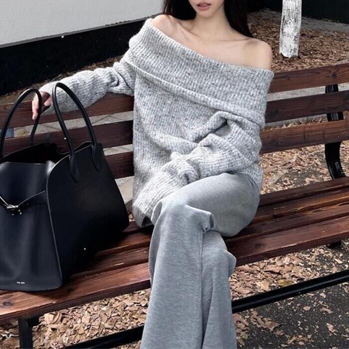 大きいサイズ 体型カバー エレガント フェミニン おしゃれ シンプル トップス ニット セーター カットソー レディース きれいめ カジュアル 大人可愛い 春 秋 冬 オフショルダー 長袖 肌見せ ボートネック リブ ゆったり 韓国 グレー 20代 30代 40代 50代 S M L XL
