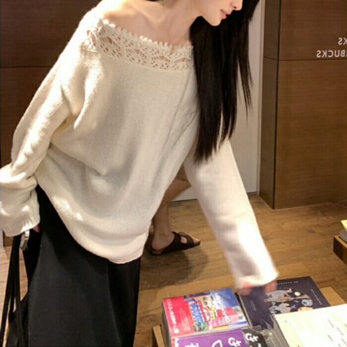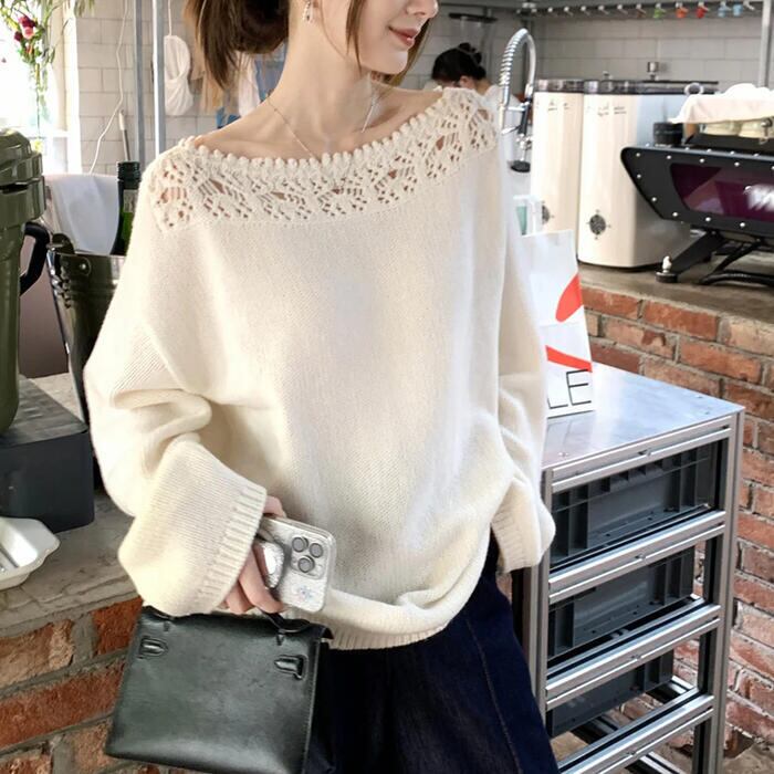 デコルテラインを美しく魅せる、レース編みデザインがポイントのニットプルオーバー。