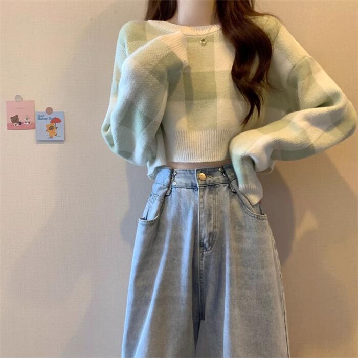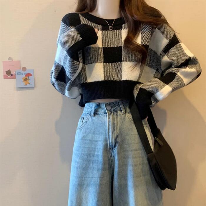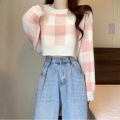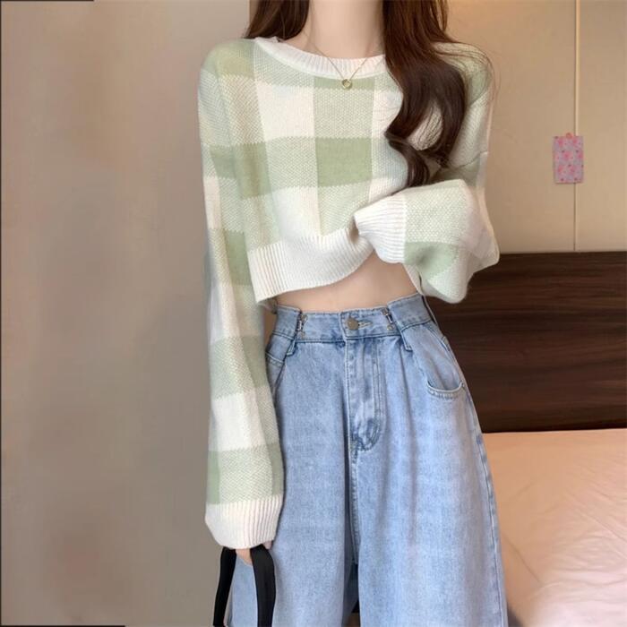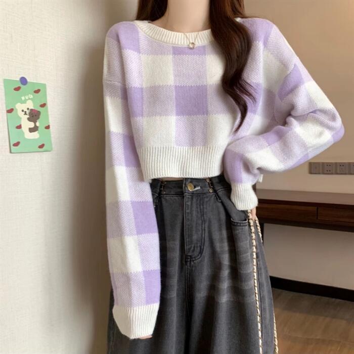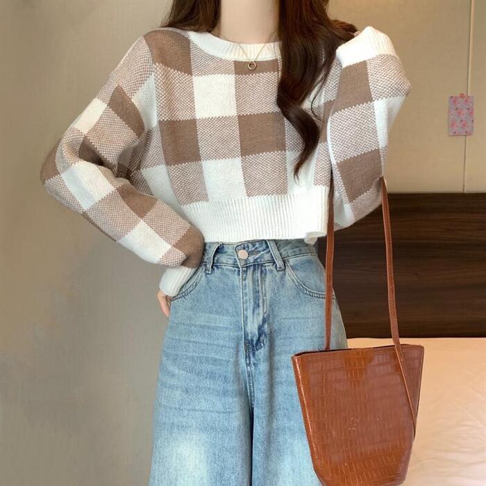 全6色 大きいサイズ 体型カバー エレガント フェミニン おしゃれ クロップド丈 トップス ニット セーター レディース きれいめ カジュアル 大人可愛い 春 秋 冬 クルーネック チェック 長袖 ショート丈 ブルー 青 ブラウン ブラック 黒 ピンク グリーン 緑 パープル 紫 20代 30代 40代 50代 S M L