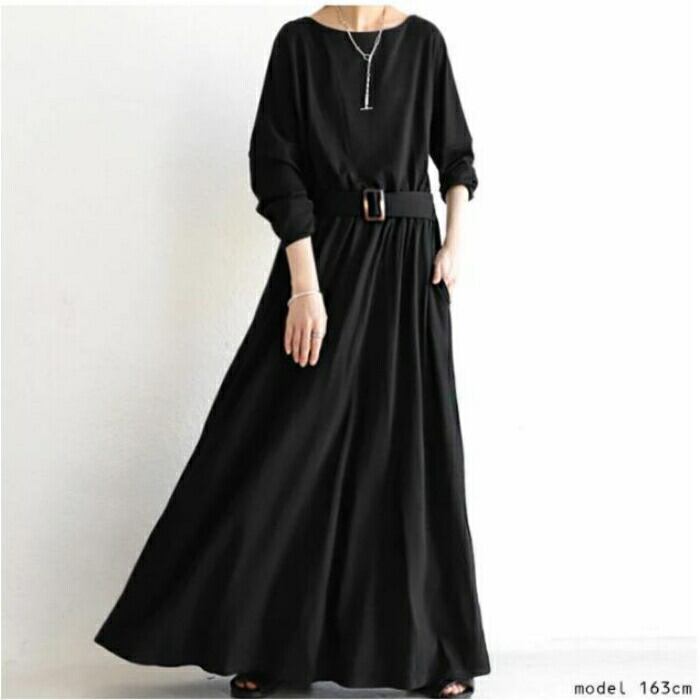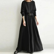 大きいサイズ 体型カバー エレガント フェミニン おしゃれ ワンピース ワンピ ドレス レディース きれいめ カジュアル 大人可愛い 春 秋 冬 長袖 ウエストベルト ロング丈 フレア クルーネック 無地 シンプル ブラック 黒 20代 30代 40代 50代 フリー