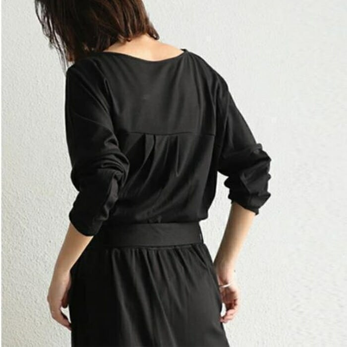 シンプルながらも洗練された印象を与える、ブラックのロングワンピース。