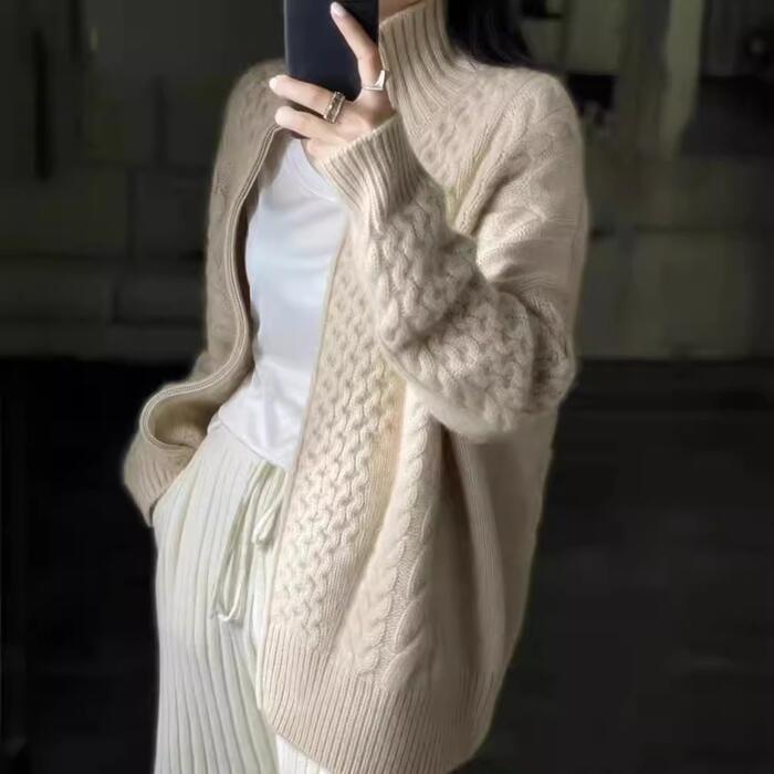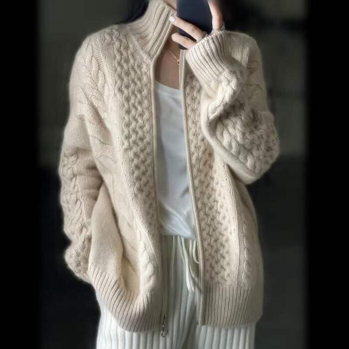 暖かみのあるケーブル編みのジップアップニットカーディガンです。