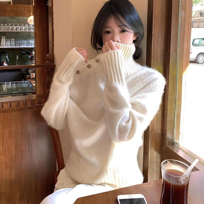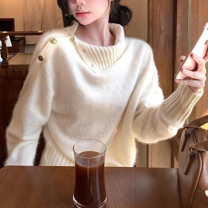 デザイン性の高い肩のボタンを閉じればハイネックとしても着用可能。