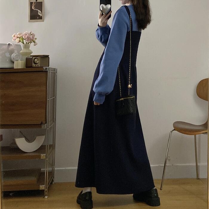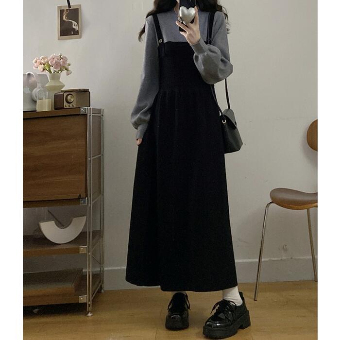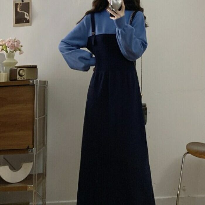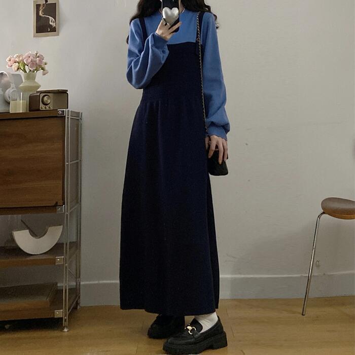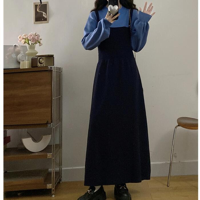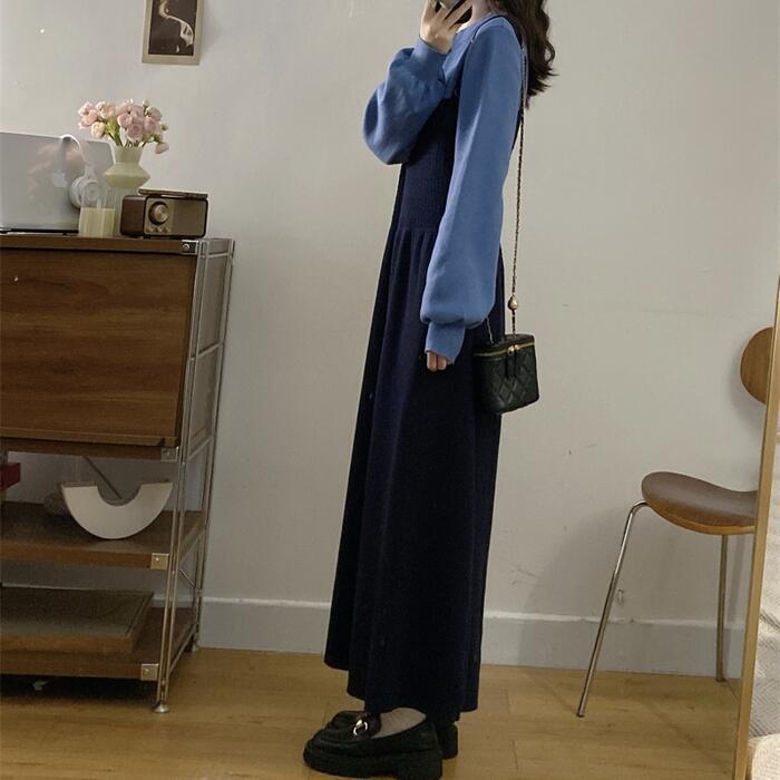 全2色 大きいサイズ 体型カバー エレガント フェミニン おしゃれ ワンピース ドレス レディース きれいめ カジュアル 大人可愛い 春 秋 冬 ニット フェイクレイヤード レイヤード風 長袖 プルオーバー ブルー 青 ブラック 黒 グレー 20代 30代 40代 50代 M L XL 2XL 3XL 4XL