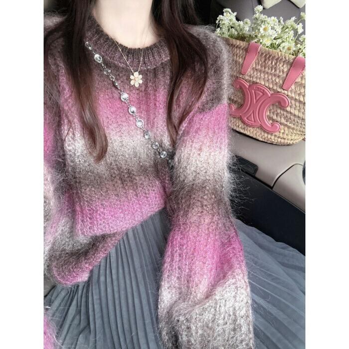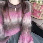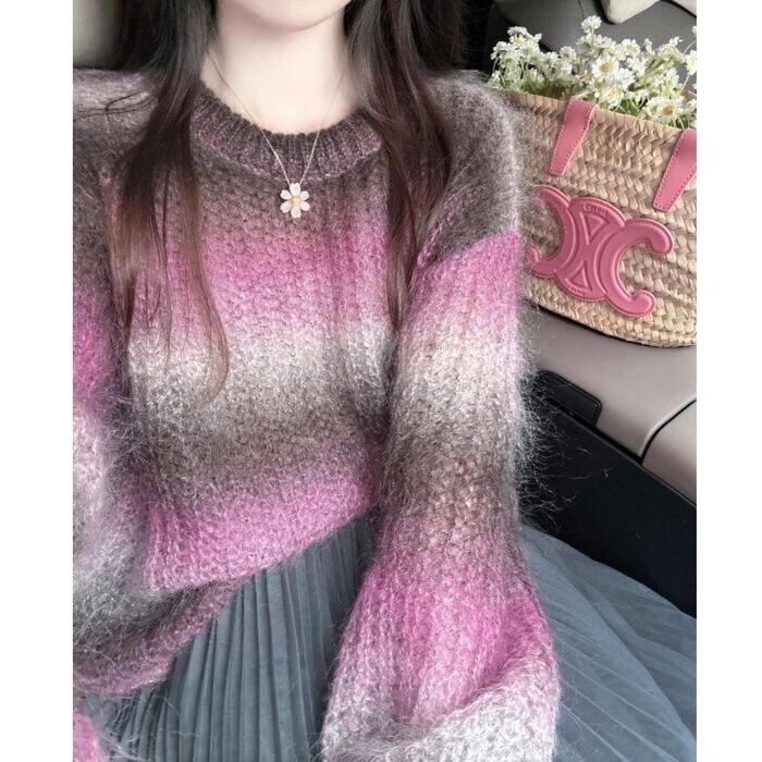 大きいサイズ 体型カバー エレガント フェミニン おしゃれ ゆったり トップス ニット セーター レディース きれいめ カジュアル 大人可愛い 春 秋 冬 クルーネック 長袖 グラデーション ボーダー プルオーバー ピンク 20代 30代 40代 50代 S M L XL