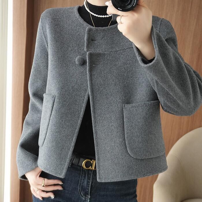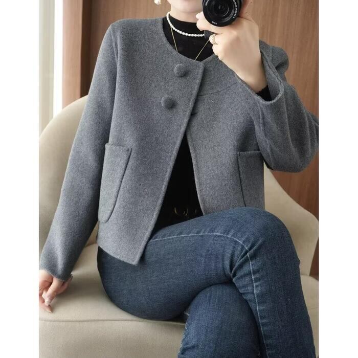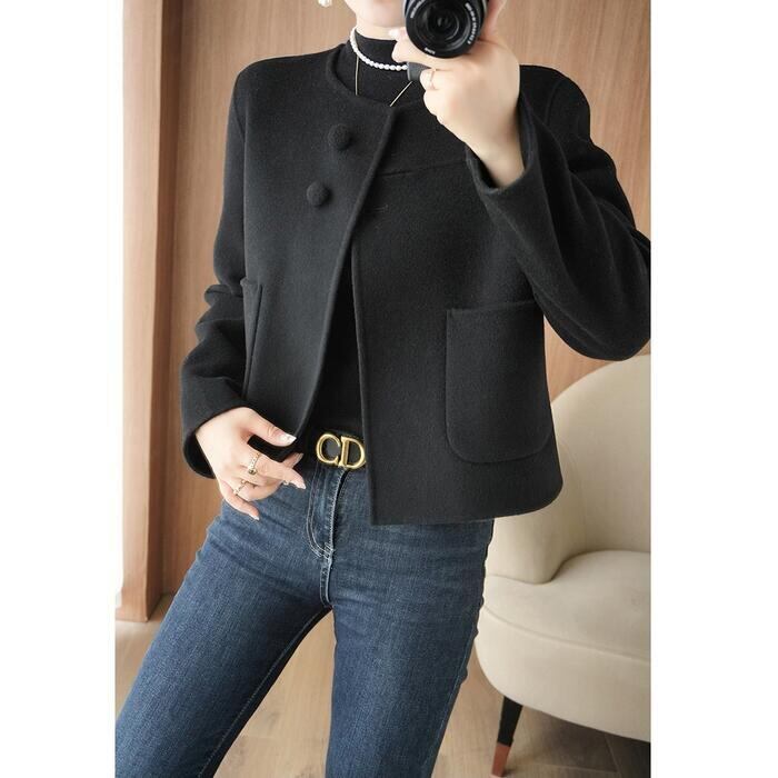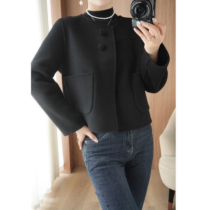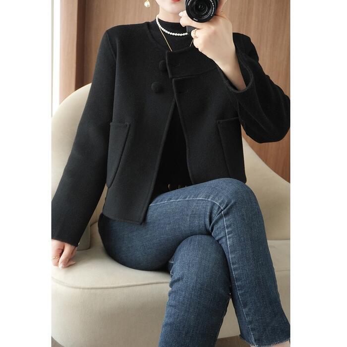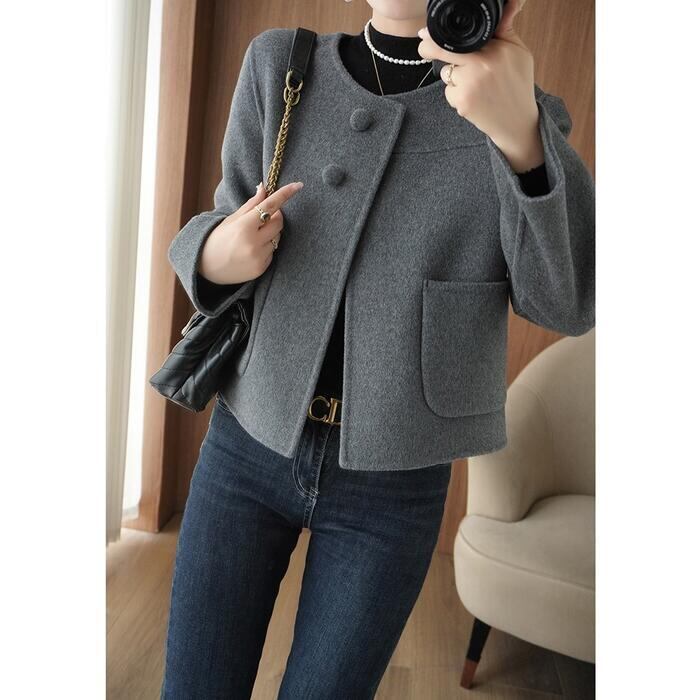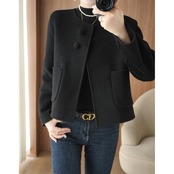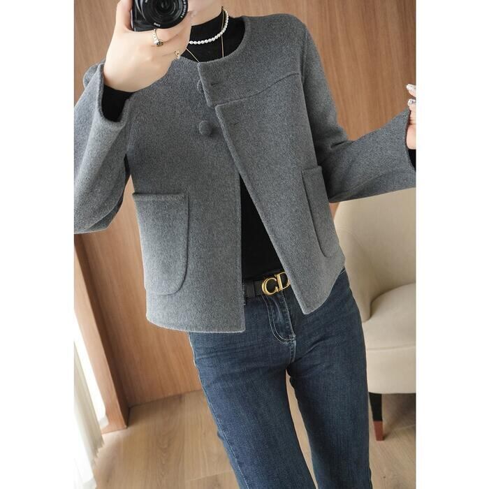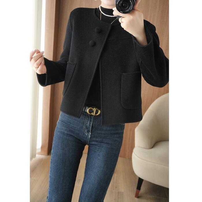 全2色 大きいサイズ 体型カバー エレガント フェミニン おしゃれ アウター ジャケット コート レディース きれいめ カジュアル 大人可愛い 春 秋 冬 ノーカラー 羽織り 長袖 ショート丈 無地 シンプル ショートコート ウール グレー ブラック 黒 20代 30代 40代 50代 M L XL