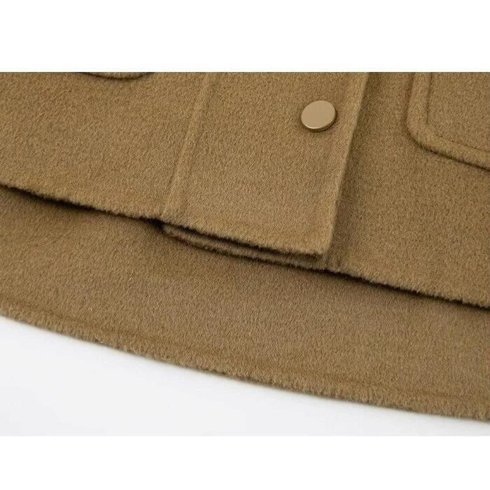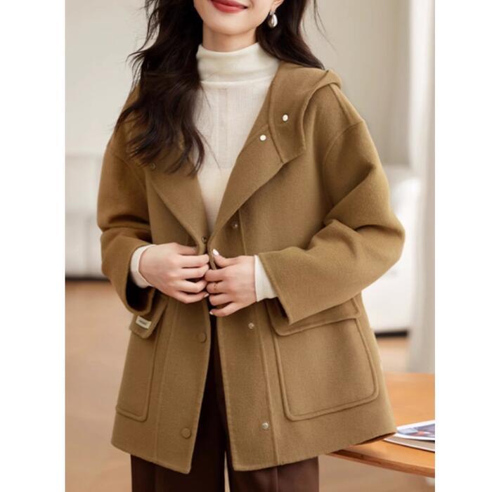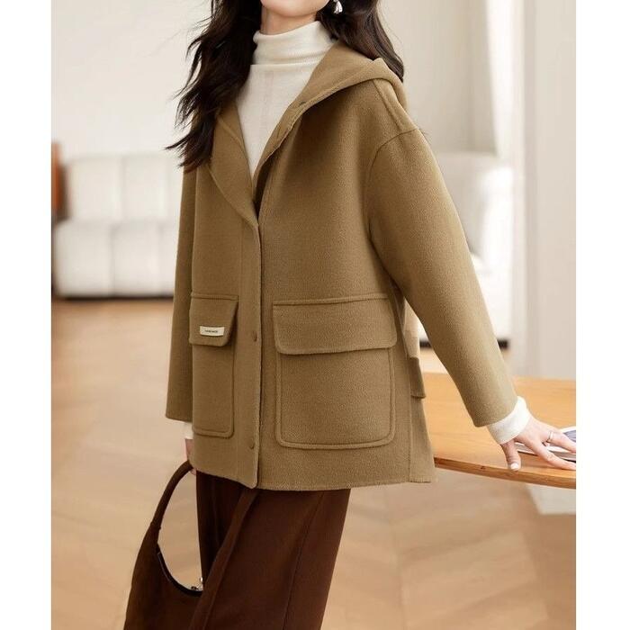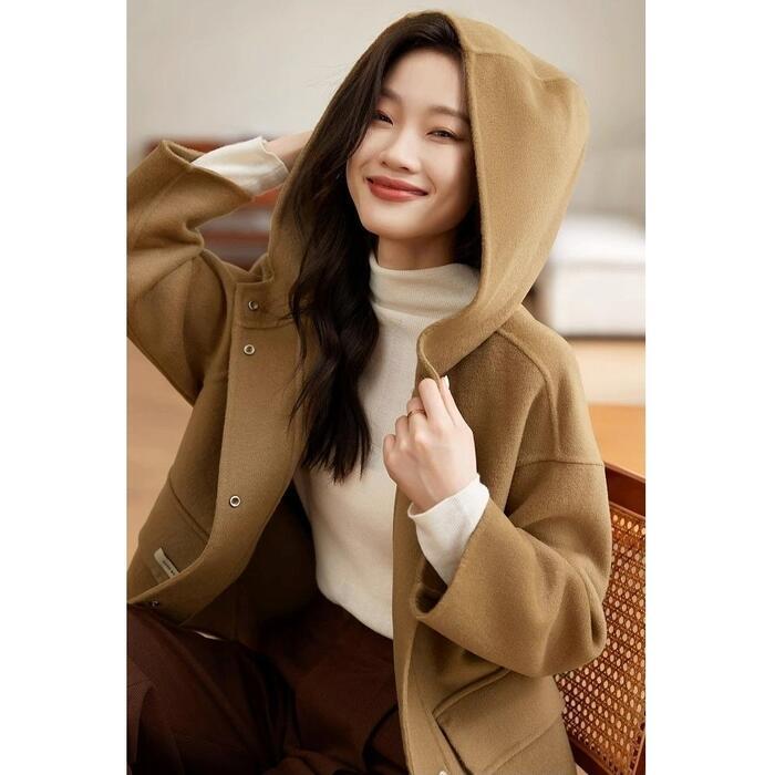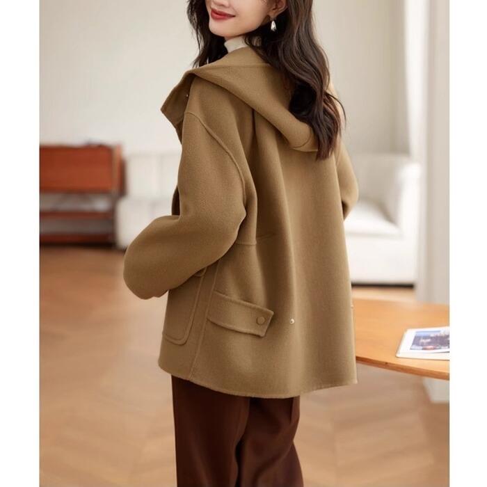 ゆったりとしたシルエットが魅力のフード付きショートコートです。
