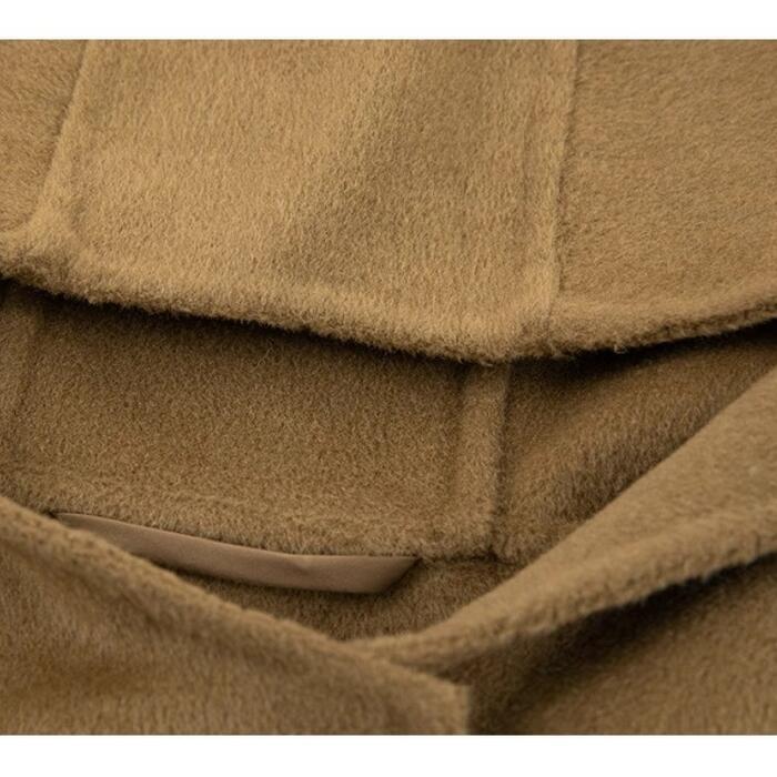 襟元と一体化したような大きめのフードが、小顔効果と抜け感をプラス。